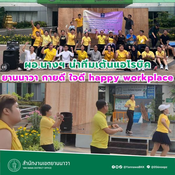 5 สิงหาคม 2567 ผอ.นางฯ (น.ส.วรุณลักษม์ พลหาญ) นำข้าราชการและบุคคลากรของสำนักงานเขตยานนาวา ร่วมออกกำลังกายด้วยการเต้นแอโรบิค ตามโครงการกายดี ใจดี happy workplace เพื่อส่งเสริมให้ข้าราชการ และบุคลากรสำนักงานเขตยานนาวามีสุขภาพแข็งแรง ซึ่งจัดกิจกรรมโดยกลุ่มร่วมใจพัฒนายานนาวา ได้รับสนับสนุนงบประมาณจากกองทุนหลักประกันสุขภาพเขตยานนาวา