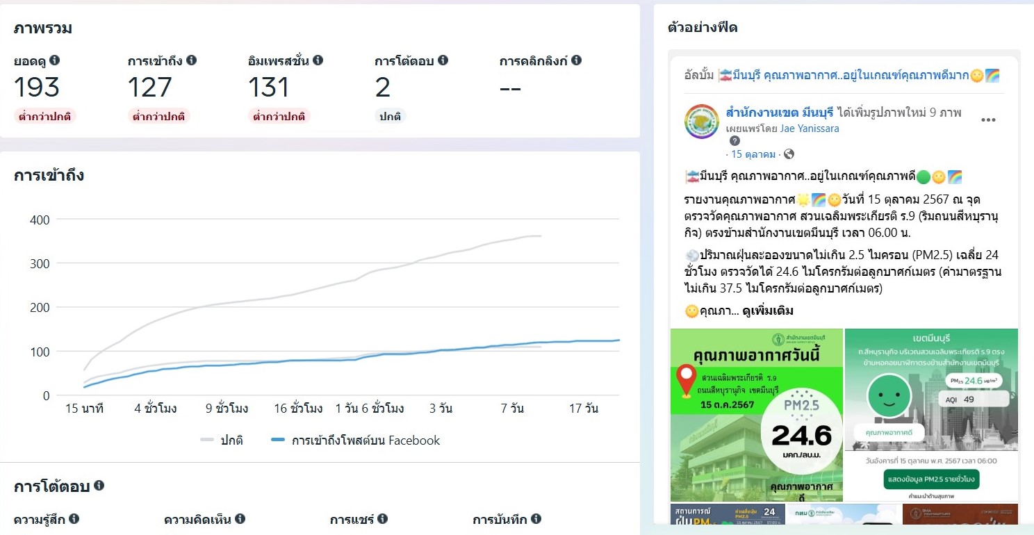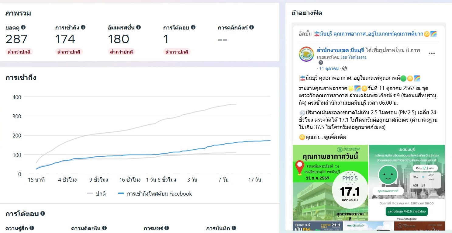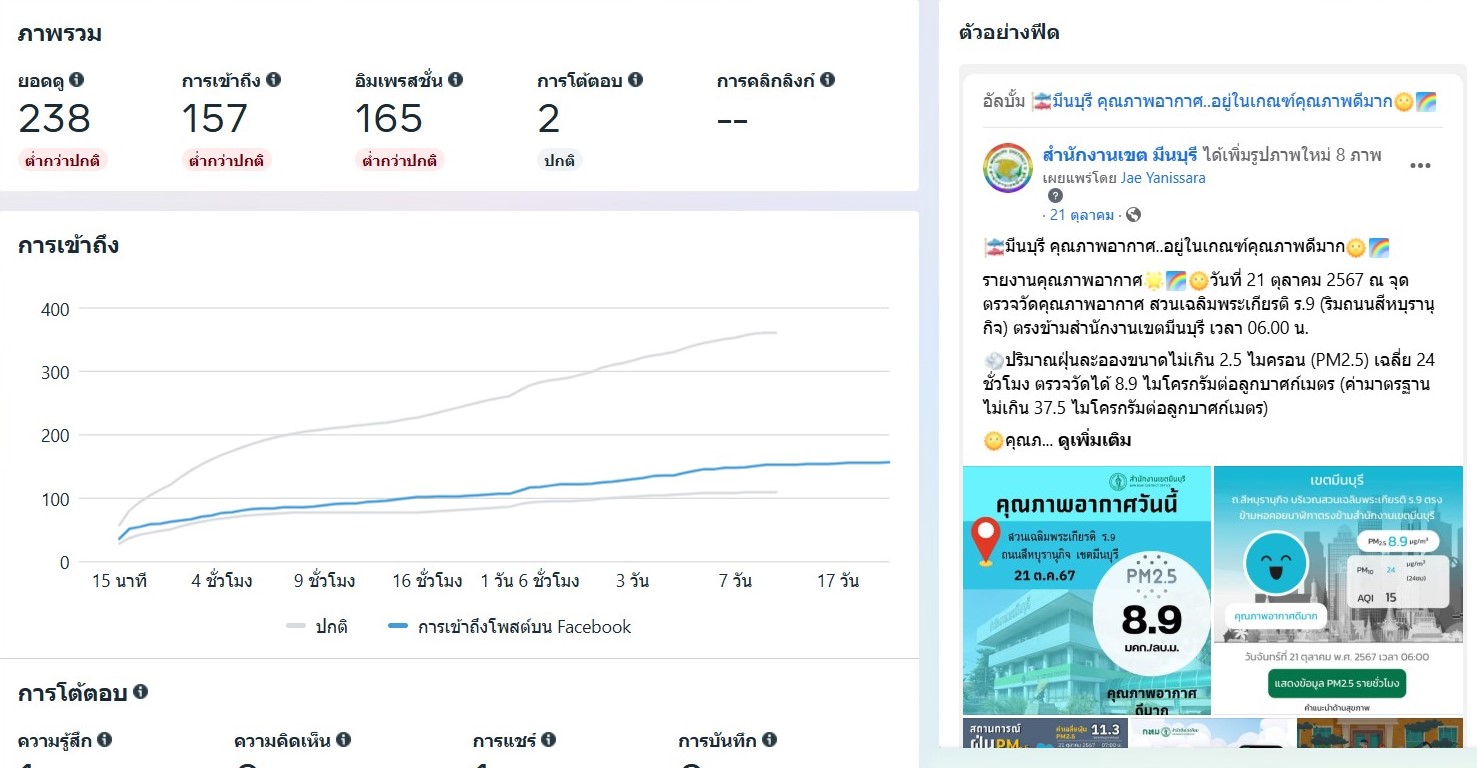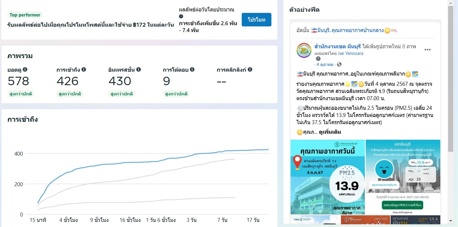 ![]() | - | กิจกรรมการเผยแพร่สื่อประชาสัมพันธ์และการเข้าถึงสื่อประชาสัมพันธ์ที่เผยแพร่(Engagement) | 0.00 | 100.00 | สำนักงานเขตมีนบุรี | ฝ่ายปกครอง |