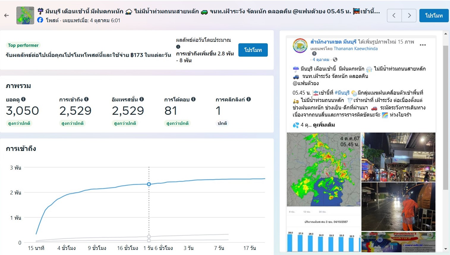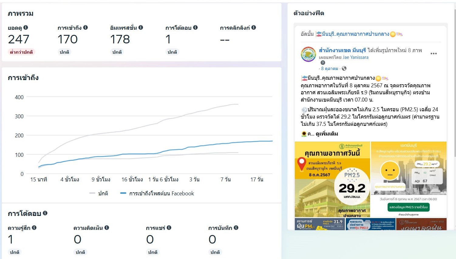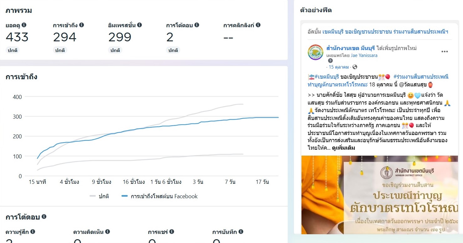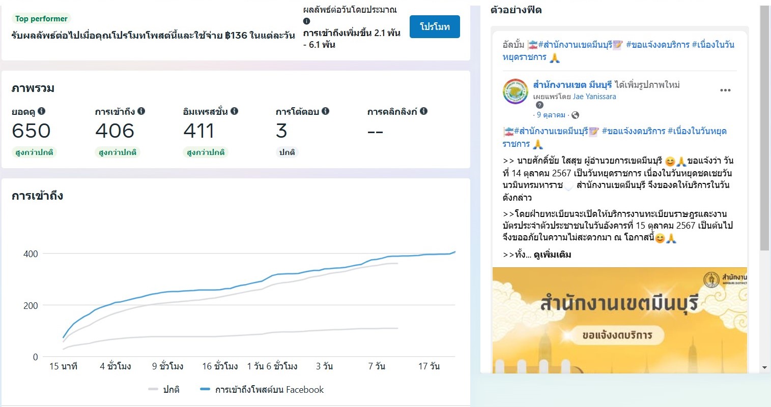 ![]() | - | กิจกรรมการเผยแพร่สื่อประชาสัมพันธ์และการเข้าถึงสื่อประชาสัมพันธ์ที่เผยแพร่(Engagement) | 0.00 | 100.00 | สำนักงานเขตมีนบุรี | ฝ่ายปกครอง |
