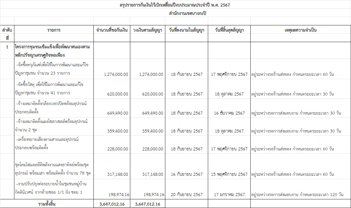 | 19 | ![]() | 2024-08-06 00:00:00.0000000 | 0.00 | 0.00 | อยู่ระหว่างดำเนินการตามโครงการ - โครงการสัมมนา ศึกษาดูงาน จำนวน 7 โครงการ ดำเนินการเมื่อวันที่ 3-5 ส.ค. 67 อยู่ระหว่างเบิกจ่ายงบประมาณ - โครงการจัดซื้อ จัดจ้าง จำนวน 25 โครงการ(25ชุมชน) โดยแบ่งเป็นรายการจัดซื้อจัดจ้าง จำนวน 7 โครงการ อยู่ระหว่างดำเนินการประกาศแผนจัดซื้อจัดจ้าง ดังนี้ 1. จัดซื้อวัสดุในการพัฒนาและแก้ไขปัญหาชุมชน 2. จัดซื้อครุภัณฑ์ เพื่อใช้ในการพัฒนาและแก้ไขปัญหาชุมชน 3. จัดซื้อชุดโคมไฟแอลอีดีพลังงานแสงอาทิตย์และชุดอุปกรณ์พร้อมติดตั้ง 4. จ้างเหมาติดตั้งกล้องวงจรปิดพร้อมอุปกรณ์ 5. จ้างเหมาติดตั้งเครื่องขยายเสียงพร้อมอุปกรณ์ 6. จ้างเหมาติดตั้งแผงโซล่าเซลล์ พร้อมอุปกรณ์ 7. จ้างเหมาซ่อมแซมทางคสล.ชุมชนริมคลองหัวหมากน้อย - โครงการไม่ได้รับการอนุมัติจากคณะอำนวยการฯ จำนวน 1 โครงการ อยู่ระหว่างดำเนินการแก้ไขรายละเอียดเพื่อเสนอพิจารณาอีกครั้ง |