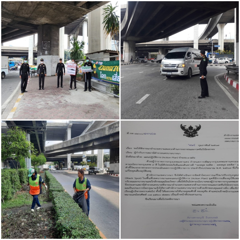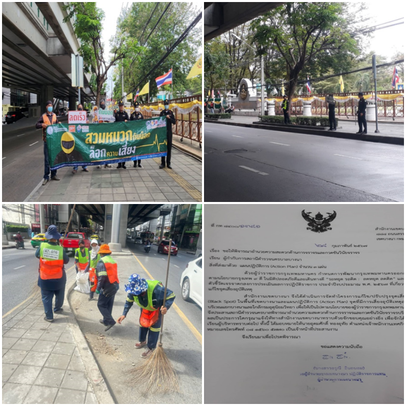 | 11 | ![]() | 2024-01-30 00:00:00.0000000 | 0.00 | 0.00 | 1. ผู้บริหารกรุงเทพมหานคร (รองปลัดกรุงเทพมหานคร หัวหน้ากลุ่มภารกิจ) เห็นชอบแผนฯ เมื่อวันที่ 18 มกราคม 2567 ตามหนังสือที่ กท 8400/180 ลงวันที่ 12 มกราคม 2567 2. ดำเนินการตามแผน จุดเสี่ยงที่ 1 แยกบางนา ดังนี้ 1) ฝ่ายเทศกิจ ดำเนินการดังนี้ - จัดกิจกรรมกวดขันวินัยจราจร / อำนวยความสะดวกด้านการจราจร และผู้สัญจร - ประสาน สน.บางนาในการกวดขันวินัยจราจร - ประสาน สจส.พิจาณา ดำเนินการติดตั้งป้ายเตือน และ Reflective sheeting 2) ฝ่ายรักษาความสะอาดฯ ปรับปรุงทัศนวิสัยในการขับขี่ โดยตัดเเต่งกิ่งไม้ ดูแลรักษาความสะอาด | ||