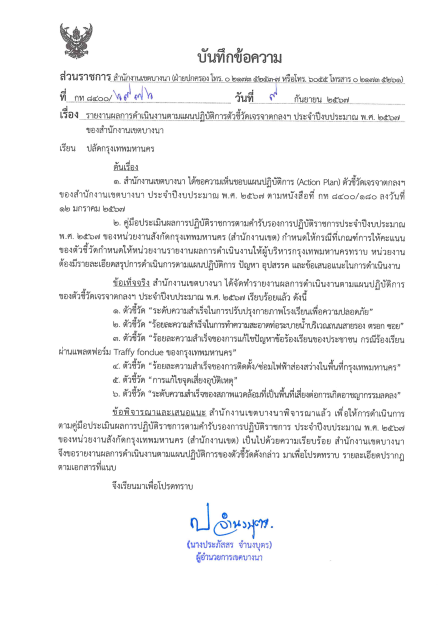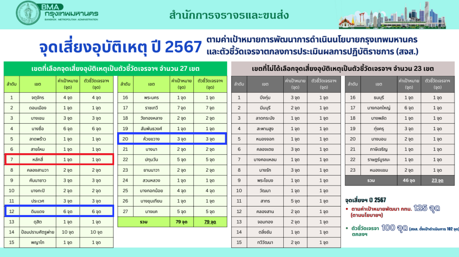 | 11 | ![]() | 2024-09-26 00:00:00.0000000 | 0.00 | 0.00 | 1. รายงานผลการดำเนินงานการแก้ไขจุดเสี่ยงอุบัติเหตุ พร้อมปัญหาอุปสรรค และข้อเสนอแนะ เสนอผู้บริหารกรุงเทพมหานครทราบ ตามหนังสือ ที่ กท 8400/6976 ลงวันที่ 9 กันยายน 2567 2. รายงานผลการดำเนินงานตามแผนปฏิบัติการ ให้สำนักการจราจรและขนส่งทราบ ตามหนังสือ ที่ กท 8400/7041 ลงวันที่ 9 กันยายน 2567 | ||