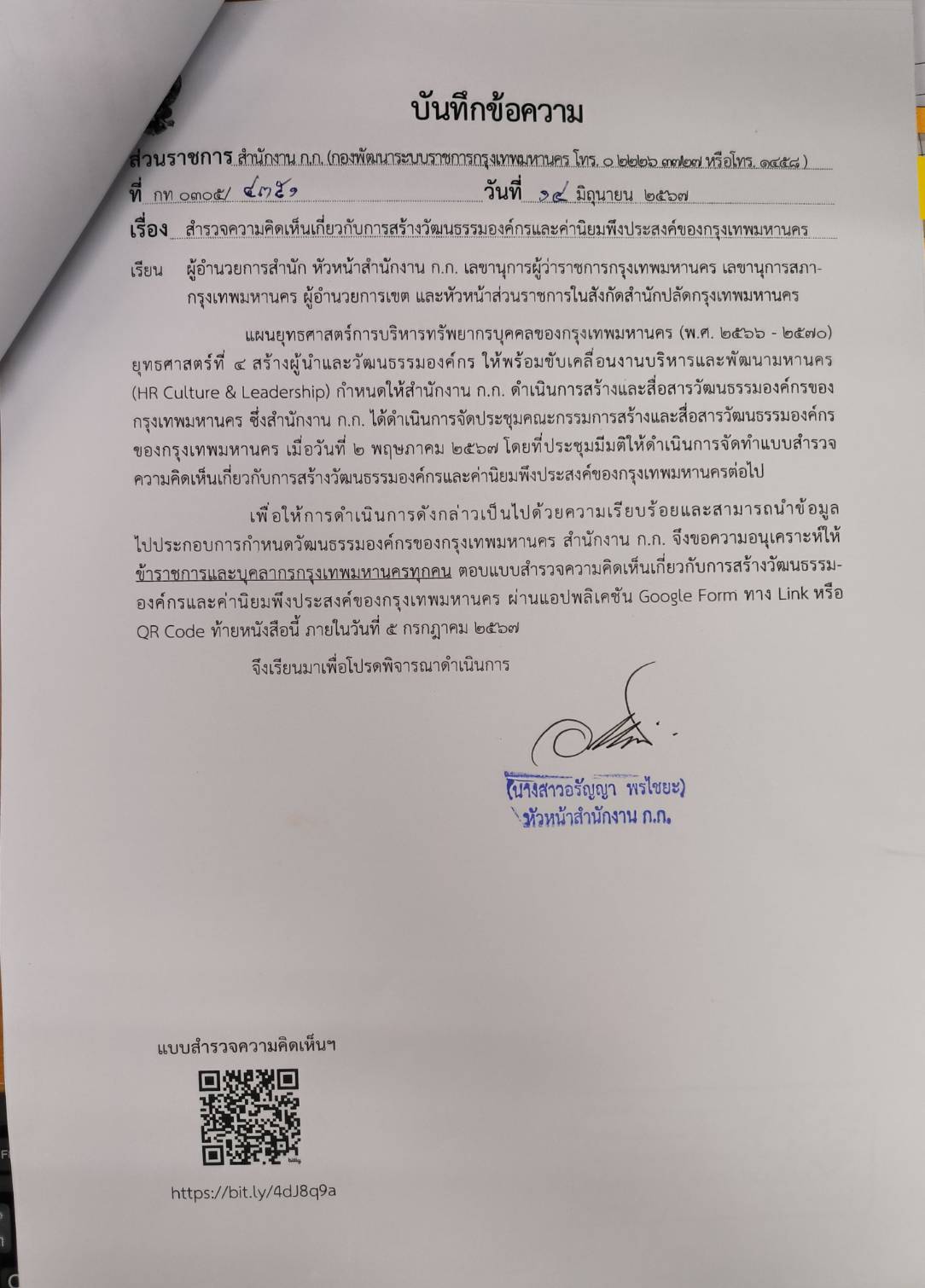| 99 | ![]() | 2024-09-20 00:00:00.0000000 | 20.00 | 0.00 | จัดทำหนังสือขอความเห็นชอบและรายงานผลต่อปลัดกรุงเทพมหานคร เพื่อจัดทำประกาศวัฒนธรรมองค์กรของกรุงเทพมหานคร ในปีงบประมาณ พ.ศ. 2568 ต่อไป (อยู่ระหว่างดำเนินการ) | ||