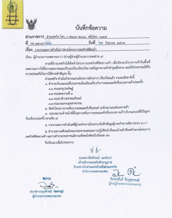 | 99 | ![]() | 2024-03-15 00:00:00.0000000 | 30.00 | 0.00 | ดำเนินการจัดเจ้าหน้าที่กวดขันการจอดหรือขับขี่รถยนต์ รถจักรยานยนต์บนทางเท้าอย่างต่อเนื่องทุกวัน |