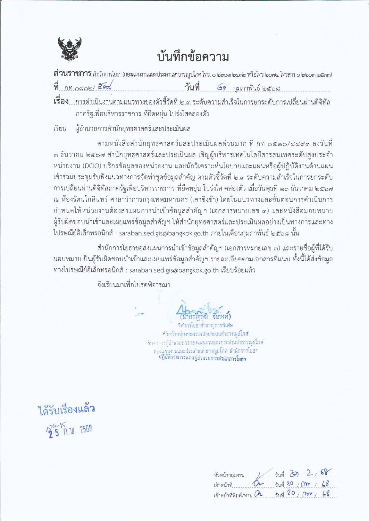 ![]() | กิจกรรมการดำเนินงานตามตัวชี้วัด 2.3 ระดับความสำเร็จในการยกระดับการเปลี่ยนผ่านดิจิทัลภาครัฐเพื่อบริหารราชการที่ยืดหยุ่น โปร่งใสคล่องตัว | 0.00 | 100.00 | สำนักการโยธา | กองแผนงานและประสานสาธารณูปโภค |