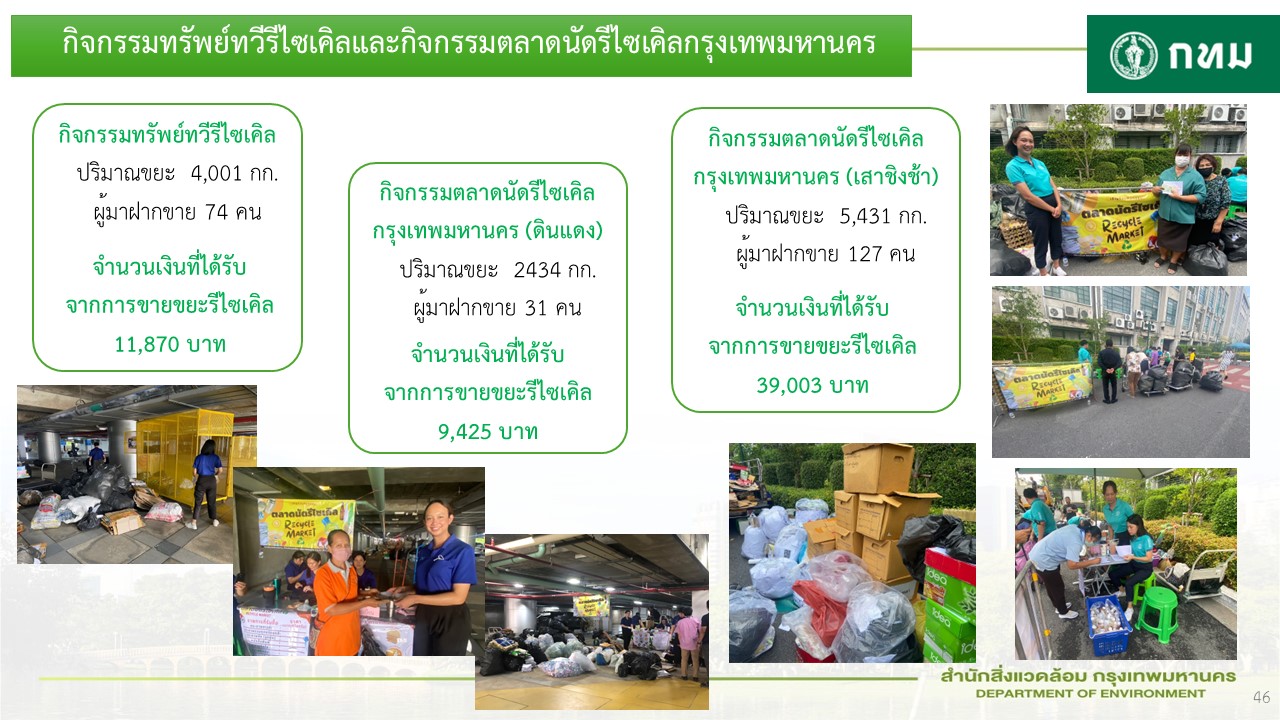 | 589 | ![]() | 2024-11-26 00:00:00.0000000 | 100.00 | 0.00 | ดำเนินการรับสมัครสมาชิกและจัดทำบัญชีเพื่อใช้ในการติดต่อสมาชิก โดยสมาชิกจะเป็นเจ้าหน้าที่ที่ปฏิบัติงานอยู่ในศาลาว่าการกรุงเทพมหานคร (ดินแดง) เจ้าหน้าที่ดำเนินกิจกรรมจะประชาสัมพันธ์แจ้งให้สมาชิกนำขยะรีไซเคิลที่มีการล้างทำความสะอาดแล้วมาใส่ไว้ในตู้ทรัพย์ทวี โดยต้องระบุรหัสสมาชิกหรือชื่อและหน่วยงานข้างถุง/หีบห่อ/มัดของขยะที่นำมาฝากขายที่ตู้ทรัพย์ทวี หลังจากนั้นเจ้าหน้าที่ดำเนินกิจกรรมจะประสานกับผู้รับซื้อเพื่อขายขยะรีไซเคิลในตู้ทรัพย์ทวี และกำหนดวันนัดกับสมาชิกเพื่อรับเงินที่ได้จากการขายขยะรีไซเคิล มีผลการดำเนินงาน ประจำปี พ.ศ. 2567 ดังนี้ ปริมาณขยะรีไซเคิลที่ขายได้ จำนวน 7,913.70 กก. คิดเป็นวงเงิน 28,575 บาท สามารถลดปริมาณก๊าซเรือนกระจกได้ 10,287.81 กิโลกรัมคาร์บอนไดออกไซด์เทียบเท่า หรือเท่ากับการปลูกต้นไม้ 857 ต้น | ||