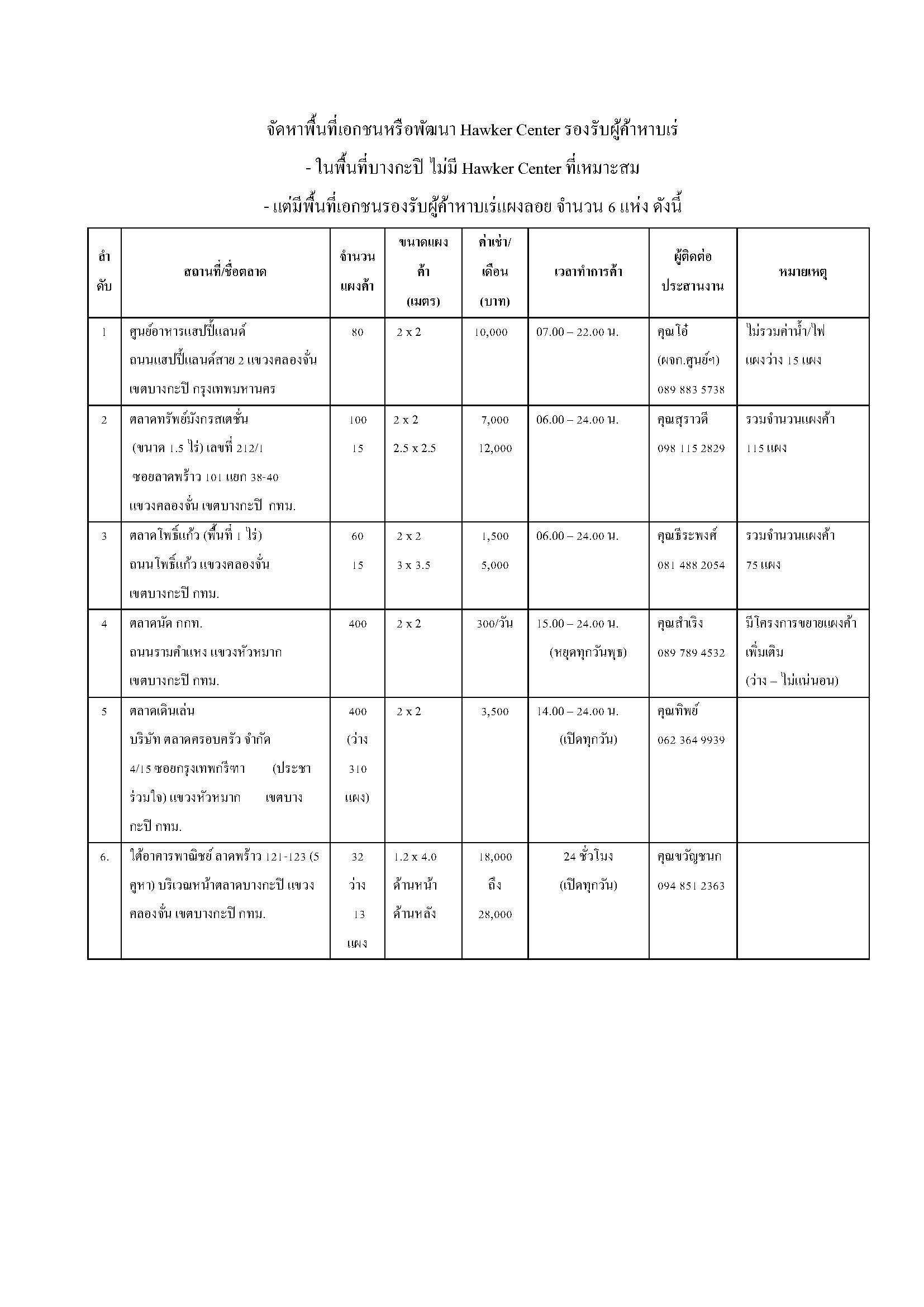 -จัดหาพื้นที่เอกชน หรือ พัฒนา Hawker Center รองรับผู้ค้าหาบเร่ (แห่ง)0.000.00สำนักงานเขตบางกะปิฝ่ายเทศกิจ
