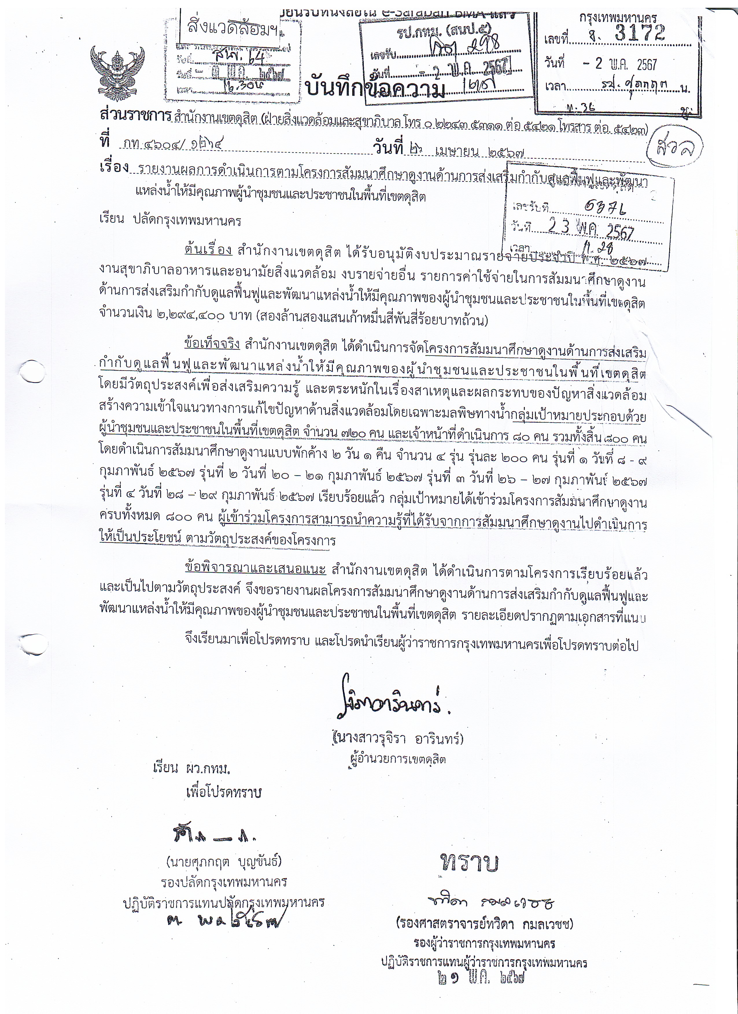 992024-08-23 00:00:00.00000005.000.00ประเมินผลโครงการ และสรุปรายงานผลให้ผู้บริหาร มีหนังสือรายงานผู้บังคับบัญชาทราบผลการดำเนินการแล้ว ตามหนังสือสำนักงานเขตดุสิต ที่ กท 4604/1264 ลงวันที่ 26 เมษายน 2567