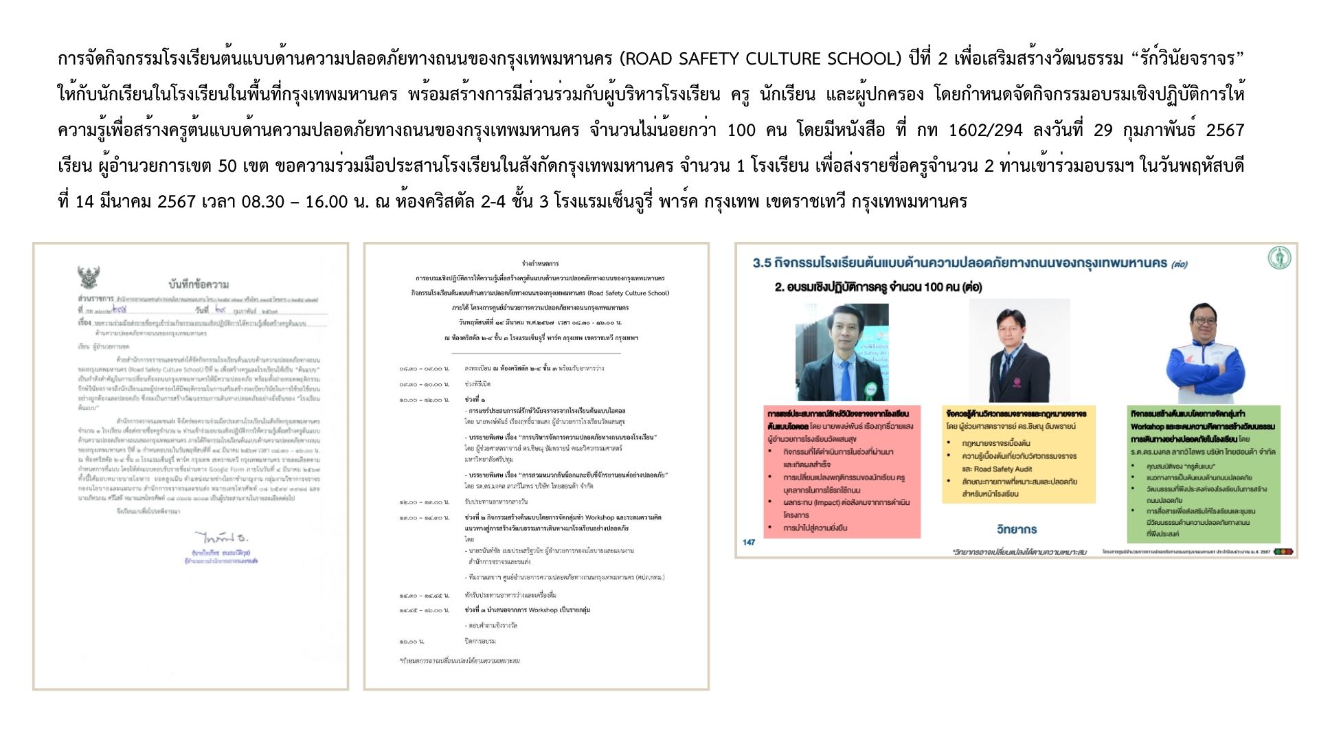 | 933 |  | 2024-06-20 00:00:00.0000000 | 5.00 | 0.00 |  | มีหนังสือที่ กท 1602/826 ลงวันที่ 11 มิถุนายน 2567 เรื่อง ขอเชิญร่วมงานเปิดตัวกิจกรรมโรงเรียนต้นแบบด้านความปลอดภัยทางถนนของกรุงเทพมหานคร (Road Safety Culture School) ปีที่ 2 และกำหนดจัดงานในวันพฤหัสบดีที่ 13 มิถุนายน 2566 เวลา 09.30 – 12.00 น. ณ ห้องรัตนโกสินทร์ ศาลาว่าการกรุงเทพมหานคร เขตพระนคร | |