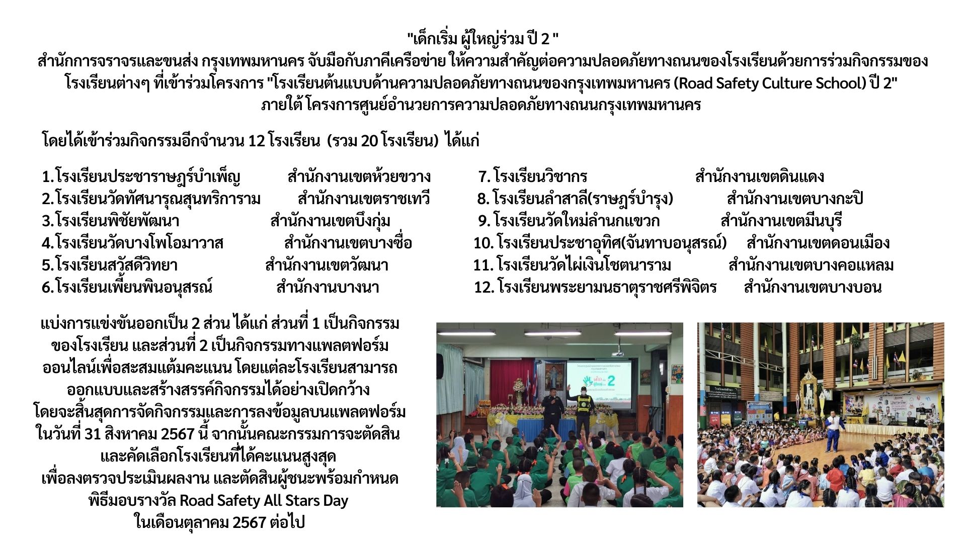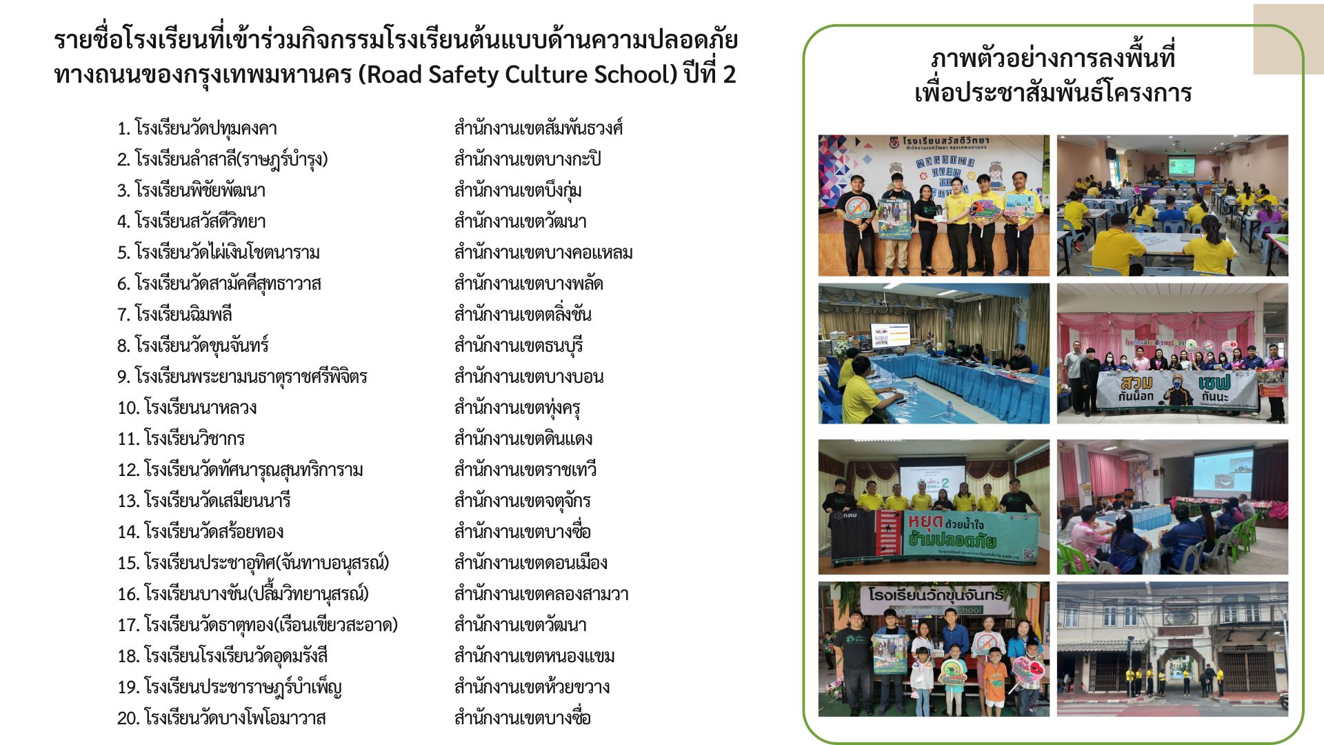โรงเรียนต่างๆ ที่เข้าร่วมโครงการ "โรงเรียนต้นแบบด้านความปลอดภัยทางถนนของกรุงเทพมหานคร (Road Safety Culture School) ปี 2"