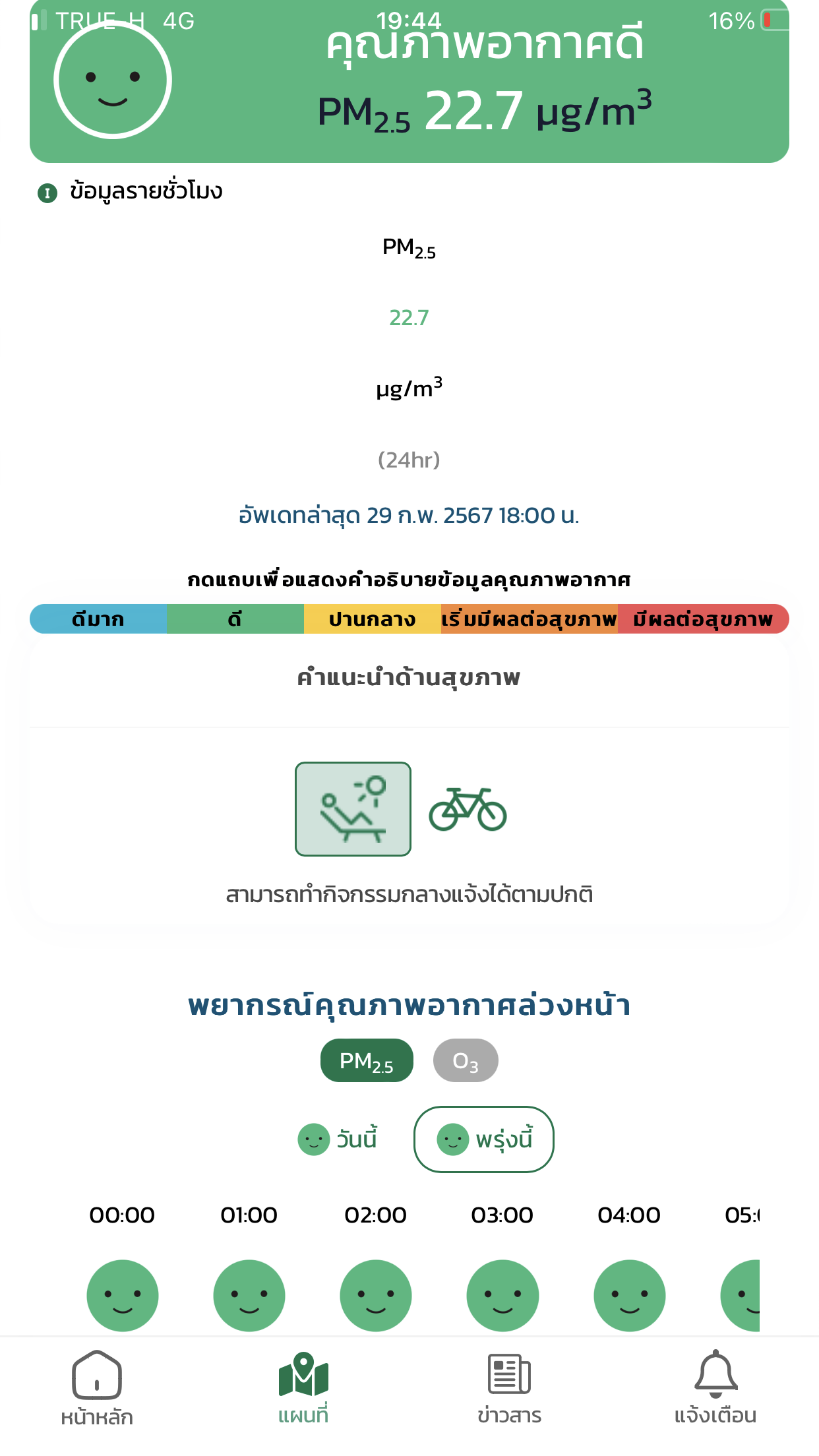 | 458 |  | 2024-08-31 00:00:00.0000000 | 0.00 | 0.00 |  | การพยากรณ์ แจ้งเตือน ป้องกันฝุ่น PM2.5 ผ่านแอปพลิเคชัน AirBKK - การพยากรณ์คุณภาพอากาศล่วงหน้า 3 วัน ได้แก่ ฝุ่นละออง PM2.5 (ฝุ่นละออง PM2.5 เฉลี่ย 24 ชั่วโมงย้อนหลัง) และก๊าซโอโซน (O3) ในแต่ละพื้นที่ที่ตั้งสถานีตรวจวัดฯ แสดงเป็นสัญลักษณ์สีรายชั่วโมง | |