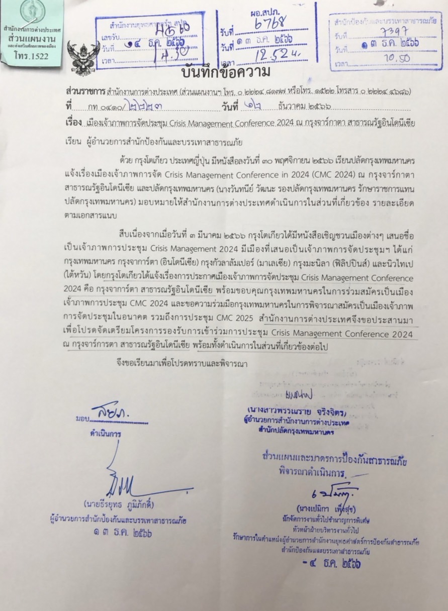 4962023-12-21 00:00:00.0000000100.000.00กรุงโตเกียว ประเทศญี่ปุ่น มีหนังสือลงวันที่ 30 พฤศจิกายน 2566 เรียนปลัดกรุงเทพมหานคร แจ้งเรื่องเมืองเจ้าภาพการจัดประชุม Crisis Management Conference 2024 (CMC2024) โดยพิจารณาตามกฎบัตรแล้ว จึงประกาศผล เมืองจาร์กาตา สาธารณรัฐอินโดนิเซีย ได้สิทธิจัดประชุม