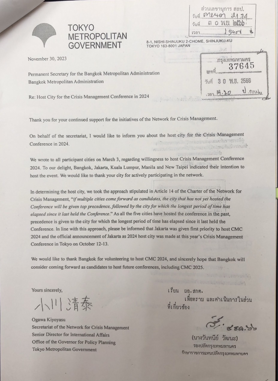 992023-12-21 00:00:00.000000097.000.00กรุงโตเกียว ประเทศญี่ปุ่น มีหนังสือลงวันที่ 30 พฤศจิกายน 2566 เรียนปลัดกรุงเทพมหานคร แจ้งเรื่องเมืองเจ้าภาพการจัดประชุม Crisis Management Conference 2024 (CMC2024) โดยพิจารณาตามกฎบัตรแล้ว จึงประกาศผล เมืองจาร์กาตา สาธารณรัฐอินโดนิเซีย ได้สิทธิจัดประชุมฯ