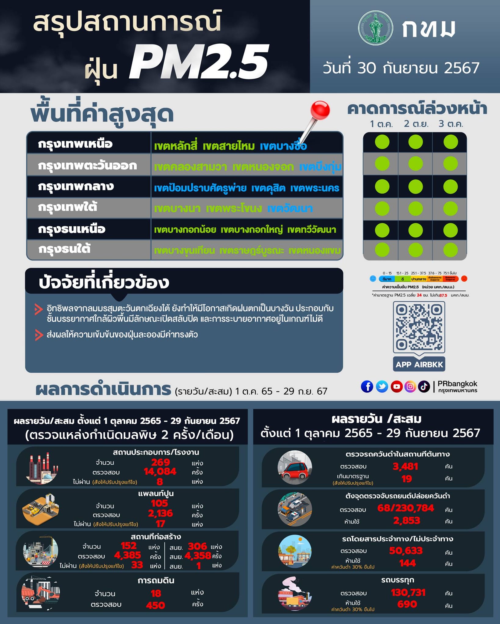 | 867 | ![]() | 2024-07-31 00:00:00.0000000 | 0.00 | 0.00 | ผลการตรวจจับรถยนต์ควันดำ สะสมตั้งแต่วันที่ 1 ตุลาคม 2566 – 30 กรกฎาคม 2567 ดังนี้ 1. สำนักงานเขตดำเนินการตรวจควันดำในสถานที่ต้นทาง 849 คัน ไม่ผ่านและสั่งให้ปรับปรุงแก้ไข 11 คัน 2. สำนักสิ่งแวดล้อม/สำนักงานเขต ร่วมกับกองบังคับการตำรวจจราจร กรมควบคุมมลพิษ และกรมการขนส่งทางบก ตรวจจับรถยนต์ปล่อยควันดำบริเวณริมเส้นทางจราจร 81,021 คัน ออกคำสั่งห้ามใช้ 620 คัน 3. สำนักสิ่งแวดล้อมร่วมกับกรมการขนส่งทางบกตรวจรถโดยสารประจำทาง/ไม่ประจำทาง 13,771 คัน พ่นห้ามใช้ 24 คัน 4. กรมการขนส่งทางบกตรวจรถบรรทุก 39,777 คัน พ่นห้ามใช้ 158 คัน | ||