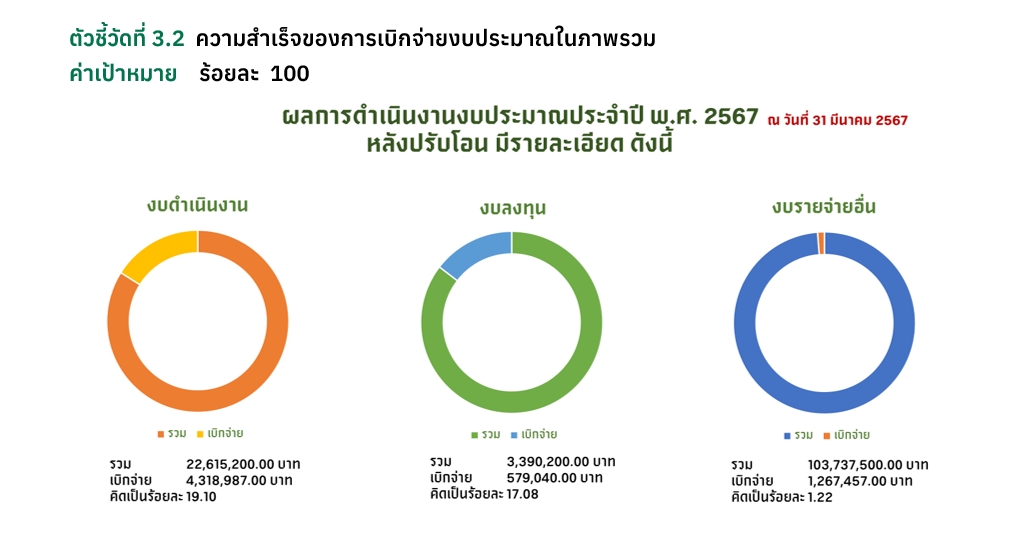 | 1415 | ![]() | 2024-04-30 00:00:00.0000000 | 20.00 | 0.00 | ผลการดำเนินงานงบประมาณประจำปี พ.ศ. 2567 ณ วันที่ 31 มีนาคม 2567 หลังปรับโอน มีรายละเอียด ดังนี้ 1. งบดำเนินการ รวม 22,615,200.00 บาท เบิกจ่าย 4,318,987.00 บาท คิดเป็นร้อยละ 19.10 2. งบลงทุน รวม 3,390,200.00 บาท เบิกจ่าย 579,040.00 บาท คิดเป็นร้อยละ 17.08 3. งบรายจ่ายอื่น รวม 103,737,500.00 บาท เบิกจ่าย 1,267,457.00 บาท คิดเป็นร้อยละ 1.22 เนื่องจากการเบิกจ่ายงบประมาณโครงการแบ่งเป็นงวดงาน ซึ่งจะครบกำหนดส่งมอบงานงวดสุดท้ายในแต่ละโครงการประมาณเดือนสิงหาคม – เดือนกันยายน เนื่องจากการประชาสัมพันธ์ต้องดำเนินการต่อเนื่อง |