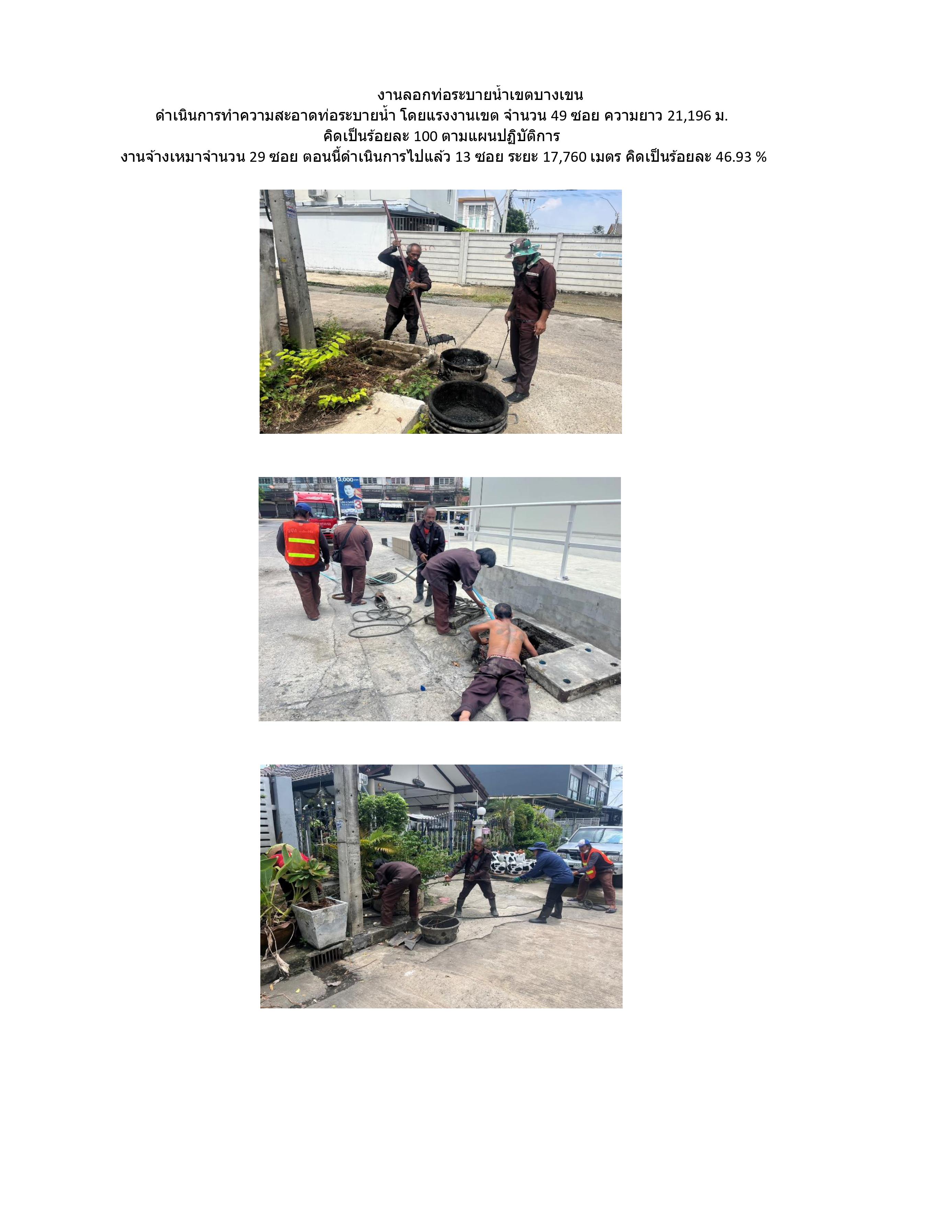 | 22 | ![]() | 2024-07-25 00:00:00.0000000 | 56.33 | 0.00 | ดำเนินการทำความสะอาดท่อระบายน้ำ โดยแรงงานเขต จำนวน 49 ซอย ความยาว 21,196 ม. คิดเป็นร้อยละ 100 ตามแผนปฏิบัติการ งานจ้างเหมาจำนวน 29 ซอย ตอนนี้ดำเนินการไปแล้ว 29 ซอย ระยะ 37,840 เมตร คิดเป็นร้อยละ 100 % | ||