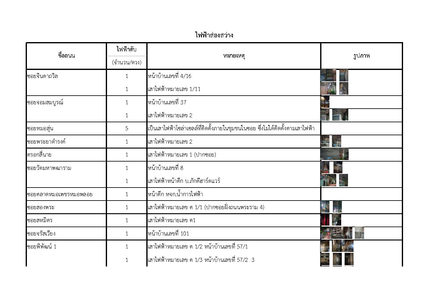52024-09-15 00:00:00.000000056.000.00เดือนตุลาคม 2566 ซ่อม 15 ดวง เดือนกุมภาพันธ์ 2567 ซ่อม 33 ดวง เดือนมีนาคม 2567 ซ่อม 7 ดวง เดือนพฤษภาคม 2567 ติดตั้ง 13 ดวง เดือนมิถุนายน 2567 ซ่อม 7 ดวง เดือนกรกฎาคม 2567 ซ่อม 6 ดวง เดือนสิงหาคม 2567 ซ่อม 9 ดวง เดือนกันยายน 2567 ซ่อม 60 ดวง รวม ติดตั้ง 13 ดวง ซ่อม 137 ดวง