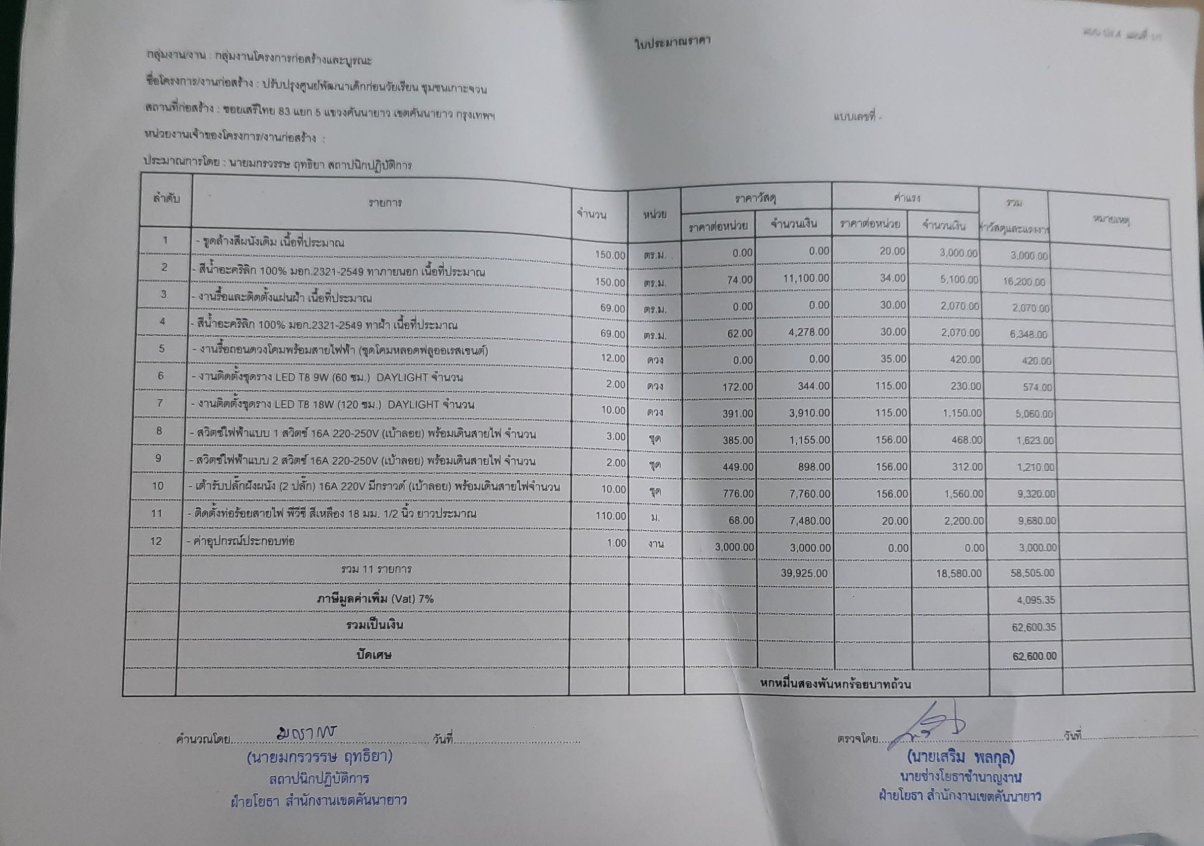 | 15 | ![]() | 2024-04-25 00:00:00.0000000 | 0.00 | 0.00 | อยู่ระหว่างการดำเนินการปรับปรุงศูนย์พัฒนาเด็กก่อนวัยเรียน จำนวน 2 แห่ง 1. ศูนย์พัฒนาเด็กก่อนวัยเรียนชุมชนบ้านเกาะ 2. ศูนย์พัฒนาเด็กก่อนวัยเรียนชุมชนเกาะจวน โดย 1. ศูนย์เด็กเล็กชุมชนบ้านเกาะ - ไม่ใช้งบประมาณ (มูลนิธิกระจกเงาให้การสนับสนุน) 2. ศูนย์เด็กเล็กชุมชนเกาะจวน - อยู่ระหว่างคำนวณเนื้องานเพื่อขอจัดสรรงบประมาณ เนื้องานที่จะดำเนินการ : ทาสีอาคารทั้งภายในและภายนอก ปรับปรุงระบบไฟฟ้าทั้งระบบ | ||
