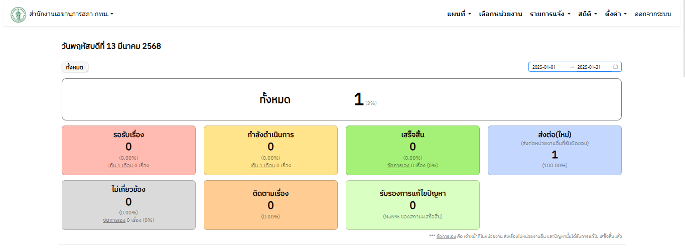 | 5131 | ![]() | 2025-01-26 00:00:00.0000000 | 8.33 | 0.00 | (1 - 31 ม.ค. 68) เรื่องร้องเรียน 1 เรื่อง ส่งต่อ 1 เรื่อง ไม่มีเรื่องค้าง | ||