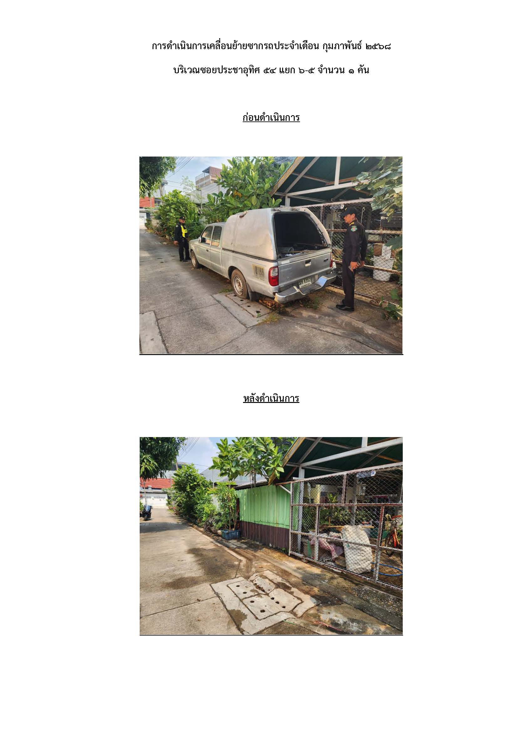 | 5015 | ![]() | 2025-02-21 00:00:00.0000000 | 1.00 | 0.00 | เดือนกุมภาพันธ์ 2568 1. ตรวจสอบพบซากยานยนต์ภายในซอยประชาอุทิศ 54 (ซอยมิตรไมตรี 6-5) เมื่อวันที่ 23 มกราคม 2568 จำนวน 1 คัน ได้ปิดประกาศให้เจ้าของซากยานยนต์ดำเนินการเคลื่อนย้าย 2. เจ้าของซากยานยนต์ดำเนินการเคลื่อนย้ายซากยานยนต์ 1 คัน เมื่อวันที่ 21 กุมภาพันธ์ 2568 เป็นที่เรียบร้อย | ||