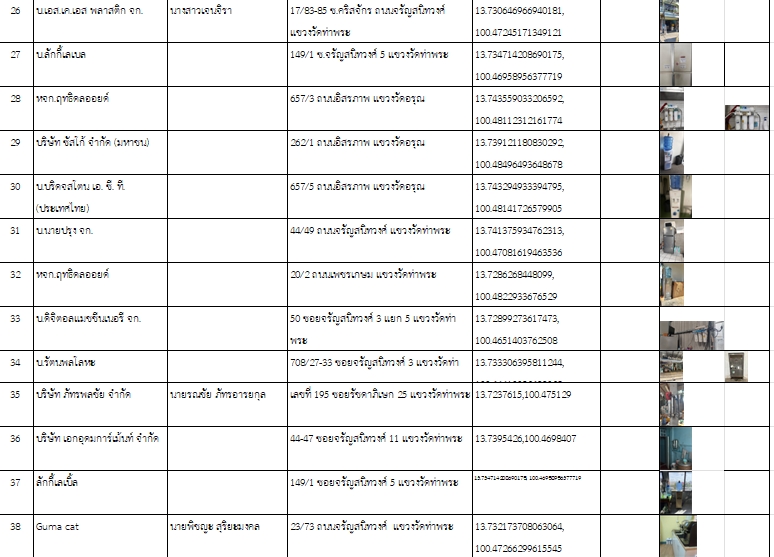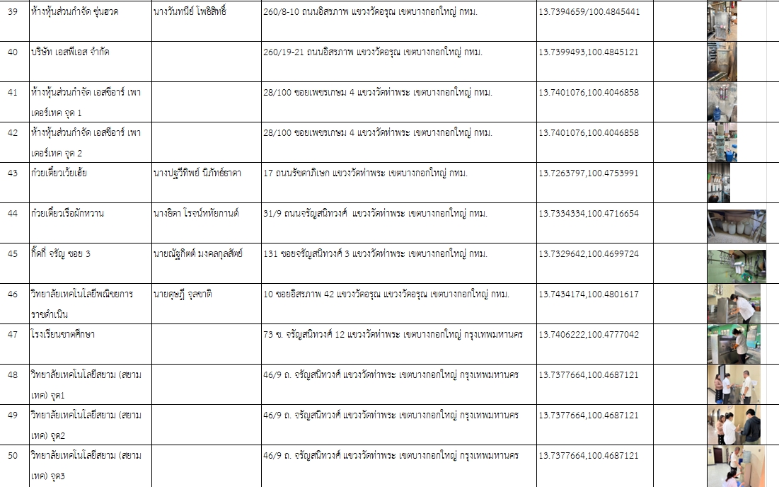 | 5410 | ![]() | 2025-01-29 00:00:00.0000000 | 13.00 | 0.00 | สำรวจจุดบริการน้ำดื่มฟรีและส่งเสริมให้หน่วยงานภาคเอกชนมีการจัดบริการน้ำดื่มฟรีและมีการดูแลให้สะอาดปลอดภัย จำนวน 13 แห่ง 26.บ.เอส.เค.เอส พลาสติก จก. 27.นายมาโนช วิทยาโกวิท 28.หจก.ฤทธิดลออยด์ สาขาอิสรภาพ 29.บริษัท ซัสโก้ จำกัด (มหาชน) สาขาอิสรภาพ 30.บ.บริดจสโตน เอ. ซี. ที. (ประเทศไทย) (ค็อคพิท สาขาอิสรภาพ) 31.บ.นายปรุง จก. 32.หจก.ฤทธิดลออยด์ สาขาเพชรเกษม 33.บ.ดิจิตอลแมชชีนเนอรี จก. 34.บ.รัตนพลโลหะ 35.บริษัท ภัทรพลชัย จำกัด 36.บริษัท เอกอุดมการ์เม้นท์ จำกัด 37.บ.ลักกี้เลเบล 38.Gume cat Cafe | ||