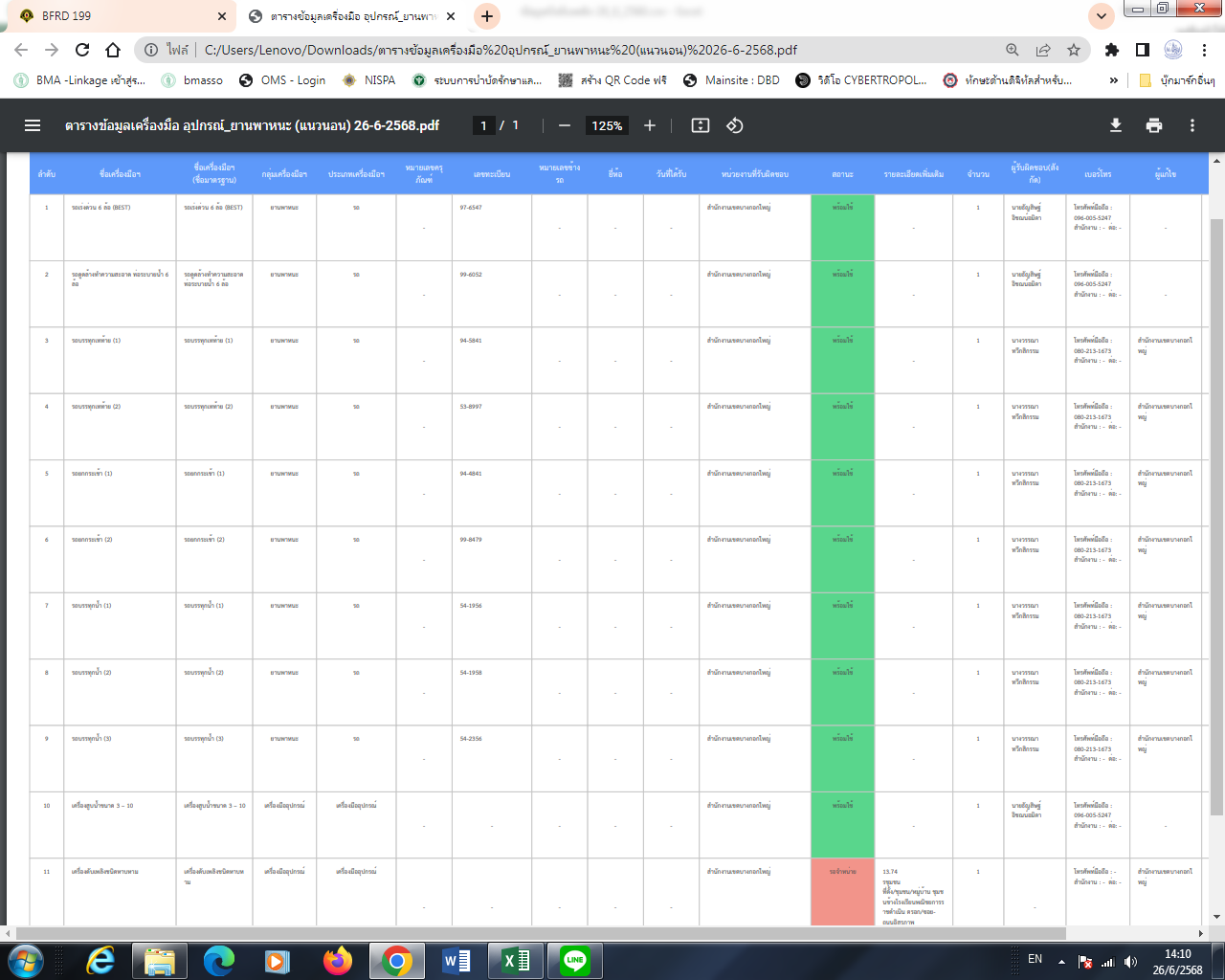 | 5100 | ![]() | 2025-06-26 00:00:00.0000000 | 0.00 | 0.00 | เดือนมิถุนายน 2568 ดำเนินการตรวจสอบสภาพยานพาหนะและลงข้อมูลในระบบฯ GIS และรายงานสถานะประจำเดือนเรียบร้อยแล้ว | ||