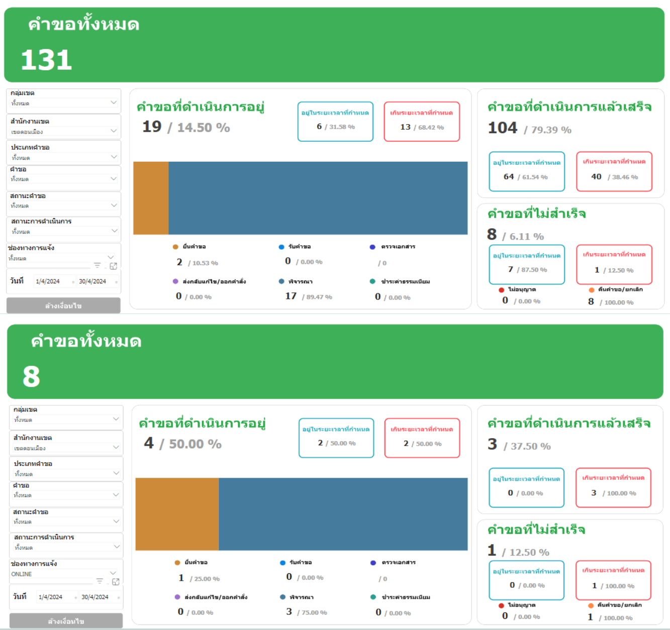 | 1414 |  | 2024-09-02 00:00:00.0000000 | 0.00 | 0.00 |  | ผู้รับบริการผ่านระบบ BMA OSS ประจำเดือนเมษายน 2567 ทั้งหมดจำนวน 131 ราย Online จำนวน 8 ราย คิดเป็นร้อยละ 6.11 | |