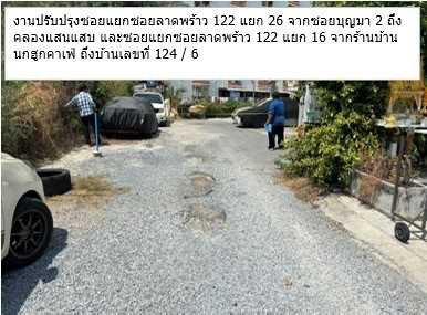 รายละเอียดโครงการ : (7) ปรับปรุงซอยแยกซอยลาดพร้าว 122 แยก 26 จากซอยบุญมา 2 ถึงคลองแสนแสบ และซอยแยกซอยลาดพร้าว 122 แยก 16 จากร้านบ้านนกฮูกคาเฟ่ ถึงบ้านเลขที่ 124/6 (ID: 5272)