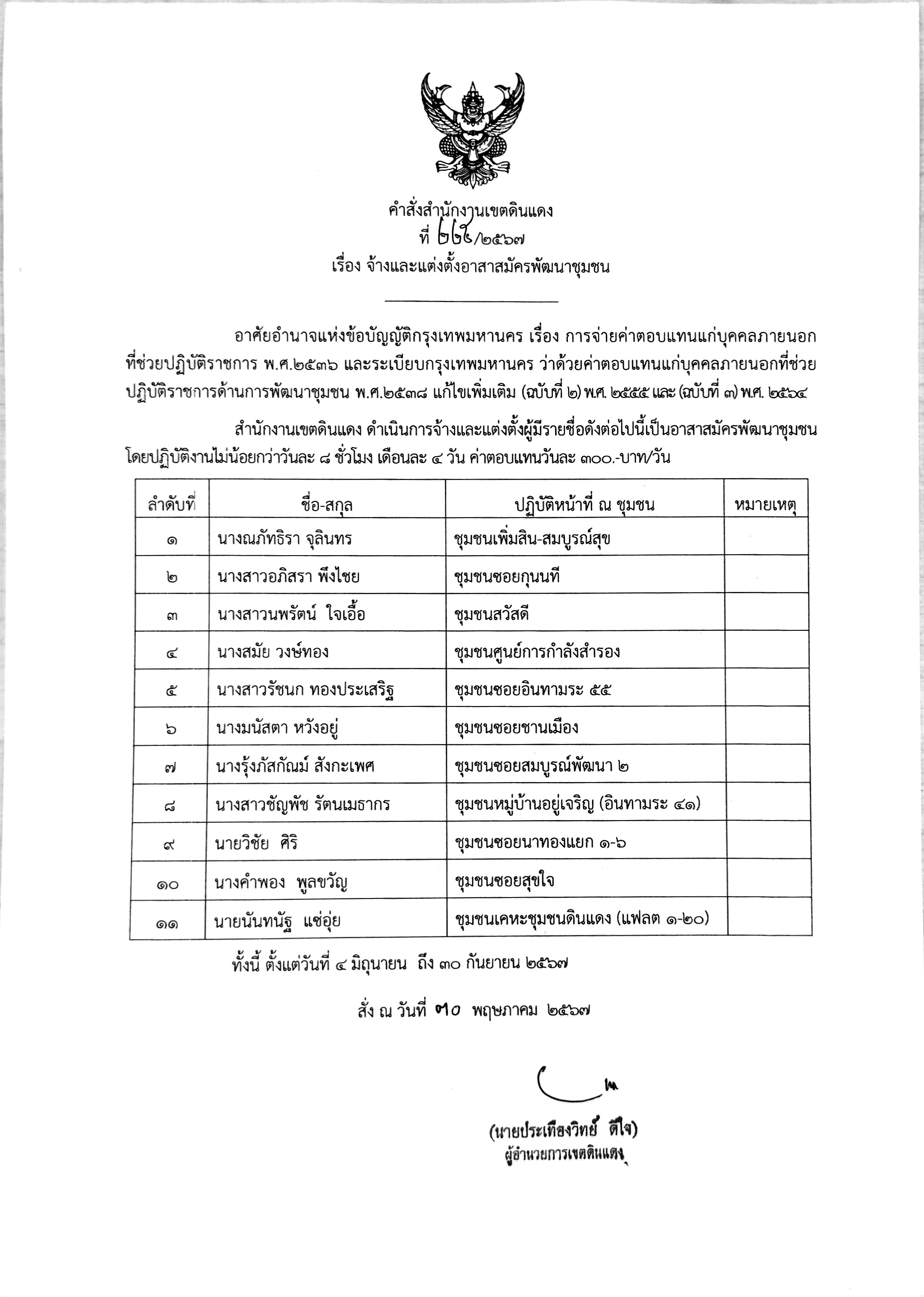 182024-06-04 00:00:00.00000000.000.00ดำเนินการจ้างและแต่งตั้งอาสาสมัครพัฒนาชุมชน เพิ่มอีก 11 คน/ชุมชน ตามคำสั่งสำนักงานเขตดินแดงที่ 225/2567 ลว. 30 พ.ค. 2567 โดยจะเริ่มปฏิบัติหน้าที่ ตั้งแต่วันที่ 4 มิ.ย. 2567 ซึ่งจะทำให้สำนักงานเขตดินแดง มี อสท. พร้อมปฏิบัติหน้าที่ รวมเป็น 14 คน/ชุมชน