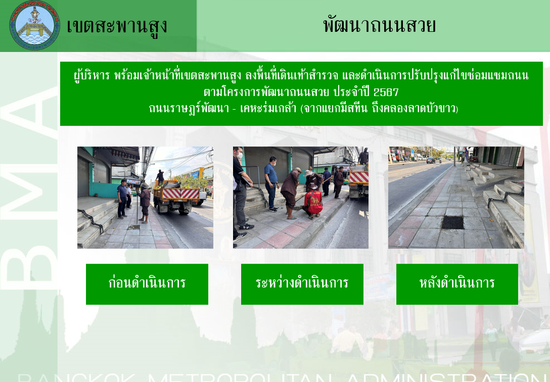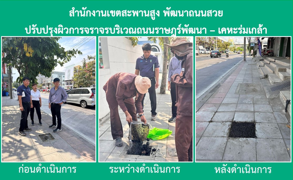 12024-03-04 00:00:00.00000000.000.00ผู้บริหาร พร้อมเจ้าหน้าที่เขตสะพานสูง ลงพื้นที่เดินเท้าสำรวจ และดำเนินการปรับปรุงแก้ไขซ่อมแซมถนน โดยเริ่มเดินเท้าสำรวจตั้งแต่แยกมิสทีน ถึงแยกแว๊กซี่ ระยะทาง 2.1 กิโลเมตร