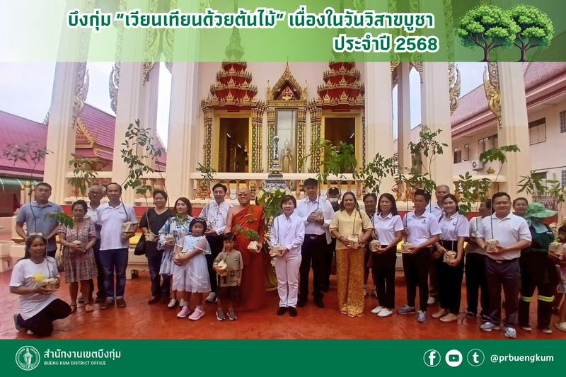 นางสาวเบญจพร ศักดิ์เรืองแมน ผู้อำนวยการเขตบึงกุ่ม พร้อมด้วยผู้บริหารเขต เจ้าหน้าที่ ครูนักเรียน และศูนย์ฯ เด็กเล็กในพื้นที่ ร่วมกับพุทธศาสนิกชน ร่วมเวียนเทียนด้วยต้นไม้ ณ วัดในพื้นที่เขตบึงกุ่ม พร้อมเชิญชวนทุกคนร่วมเวียนเทียนด้วยต้นไม้ เพื่อส่งเสริมให้ประชาชนได้นำกล้าไม้ไปปลูกเพิ่มพื้นที่สีเขียว นอกจากนี้ยังช่วยลดฝุ่นควันที่เป็นอันตรายจากการจุดธูป ลดขยะจากธูปเทียน เนื่องในวันอาสาฬหบูชา 10 กรกฎาคม 2568 | |