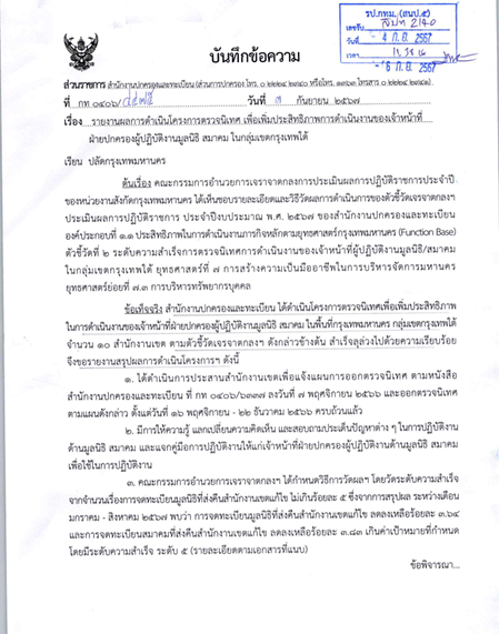 13802024-09-25 00:00:00.00000005.000.00สำนักงานปกครองและทะเบียนได้ดำเนินโครงการตรวจนิเทศเพื่อเพิ่มประสิทธิภาพในการดำเนินงานของเจ้าหน้าที่ฝ่ายปกครองผู้ปฏิบัติงานมูลนิธิ สมาคม ในพื้นที่กรุงเทพมหานคร กลุ่มเขตกรุงเทพใต้ จำนวน 10 สำนักงานเขต เรียบร้อยแล้ว โดยมีการให้ความรู้ แลกเปลี่ยนความคิดเห็น และสอบถามประเด็นปัญหาต่าง ๆ ในการปฏิบัติงานด้านมูลนิธิ สมาคม และแจกคู่มือการปฏิบัติงานให้แก่เจ้าหน้าที่ฝ่ายปกครองผู้ปฏิบัติงานเพื่อใช้ในการปฏิบัติงาน โดยวัดผลสำเร็จจากจำนวนเรื่องการจดทะเบียนมูลนิธิ สมาคม ที่ส่งสำนักงานเขตแก้ไขไม่เกิน ร้อยละ 5 ซึ่งจากการสรุปผลระหว่างเดือน มกราคม - สิงหาคม 2567 พบว่าการจดทะเบียนมูลนิธิ ที่ส่งคืนสำนักงานเขตแก้ไข ลดลงเหลือร้อยละ 3.64 การจดทะเบียนสมาคม ที่ส่งคืนสำนักงานเขตแก้ไข ลดลงเหลือร้อยละ 3.83