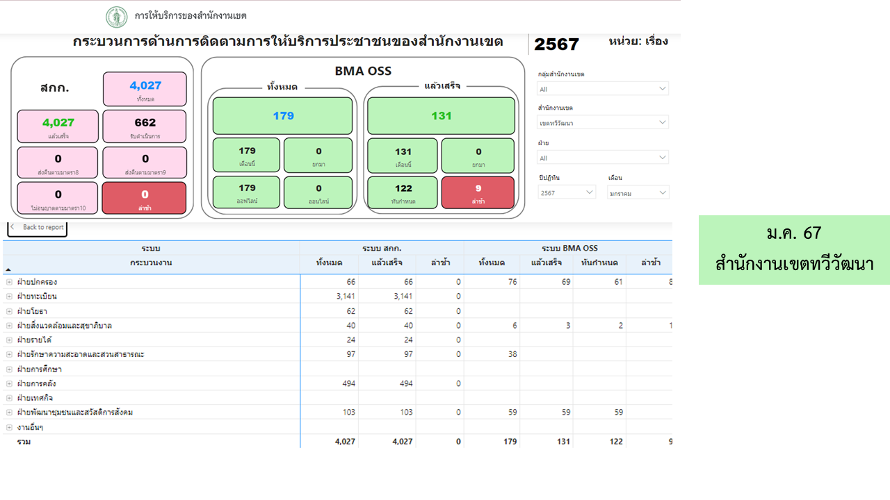 | 21 | ![]() | 2024-01-26 00:00:00.0000000 | 100.00 | 0.00 | การติดตามการให้บริการประชาชนของสำนักงานเขตทวีวัฒนา ประจำเดือน มกราคม พ.ศ. 2567 - จำนวนคำขอที่หน่วยงานได้รับทั้งหมด 4027 คำขอ - จำนวนคำขอที่สามารถให้บริการตามพรบ. การอำนวยความสะดวกในการพิจาณาอนุญาตของทางราชการ พ.ศ. 2558 จำนวน 4027 คำขอ คิดเป็น 100% | ||