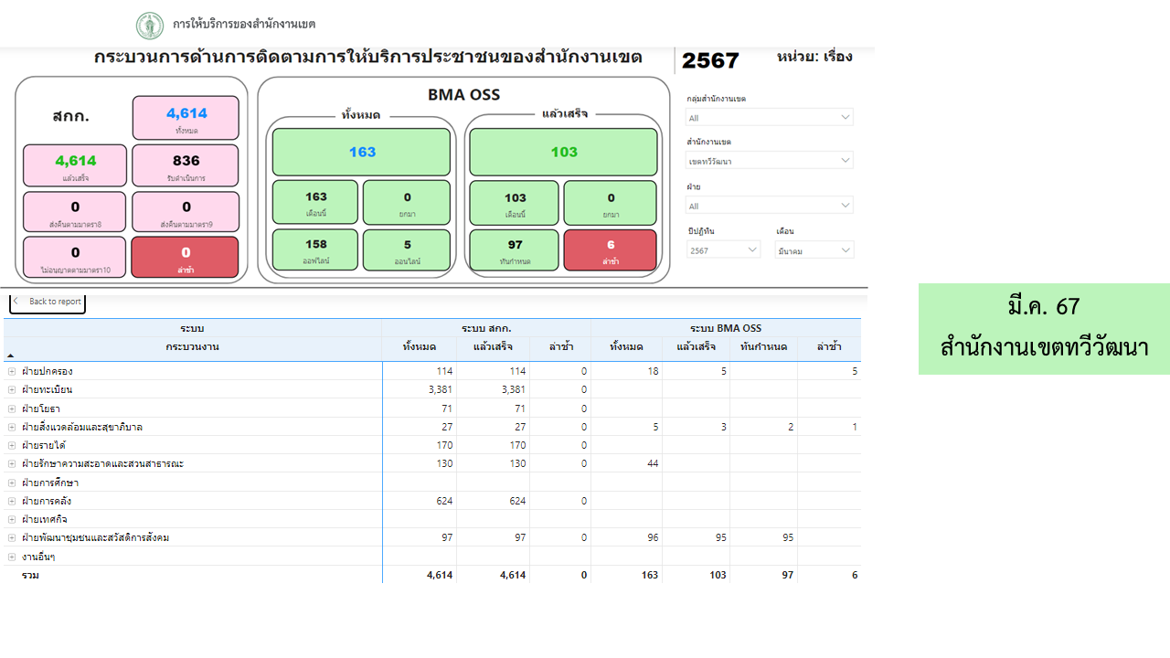 | 21 | ![]() | 2024-03-31 00:00:00.0000000 | 100.00 | 0.00 | การติดตามการให้บริการประชาชนของสำนักงานเขตทวีวัฒนา ประจำเดือน มีนาคม พ.ศ. 2567 - จำนวนคำขอที่หน่วยงานได้รับทั้งหมด 4,614 คำขอ - จำนวนคำขอที่สามารถให้บริการตามพรบ. การอำนวยความสะดวกในการพิจาณาอนุญาตของทางราชการ พ.ศ. 2558 จำนวน 4,614 คำขอ คิดเป็น 100% | ||
