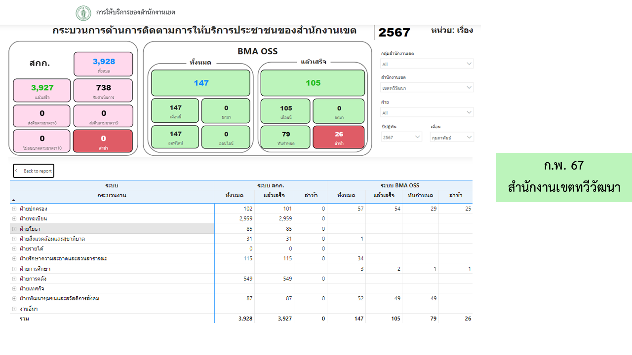 | 21 | ![]() | 2024-06-30 00:00:00.0000000 | 100.00 | 0.00 | การให้บริการประชาชนของสำนักงานเขตทวีวัฒนา ประจำเดือน มิถุนายน พ.ศ. 2567 คิดเป็น 100% - จำนวนคำขอที่หน่วยงานได้รับทั้งหมด 4,177 คำขอ - จำนวนคำขอที่สามารถให้บริการตามพรบ. การอำนวยความสะดวกในการพิจาณาอนุญาต จำนวน 4,177 คำขอ - ล่าช้า 0 คำขอ | ||