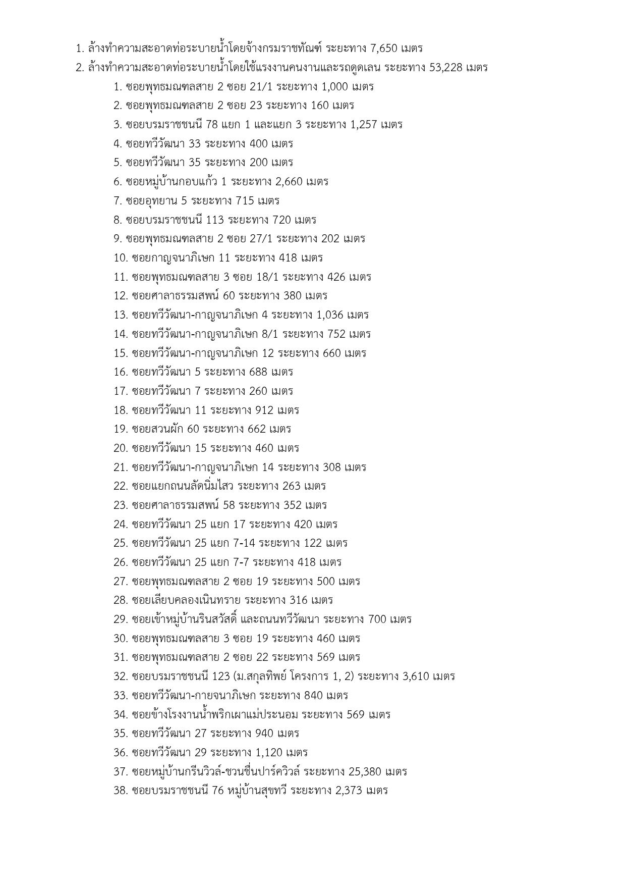 222024-07-25 00:00:00.00000000.000.001. ล้างทำความสะอาดท่อระบายน้ำโดยจ้างกรมราชทัณฑ์ ระยะทาง 7,650 เมตร 2. ล้างทำความสะอาดท่อระบายน้ำโดยใช้แรงงานคนงานและรถดูดเลน ระยะทาง 53,228 เมตร รวมระยะทาง 60,878 เมตร