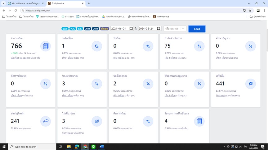 | 102 | ![]() | 2024-06-24 00:00:00.0000000 | 58.47 | 0.00 | ผลการดำเนินการแก้ไขเรื่องร้องเรียนจากประชาชน ผ่านระบบ Traffy Fondue ของสำนักงานเขตบางซื่อ ประจำเดือนมิถุนายน 2567 (ข้อมูล ณ วันที่ 30 มิ.ย. 67) จำนวนเรื่องทั้งหมด 874 เรื่อง เสร็จสิ้น 511 เรื่อง ส่งต่อ 257 เรื่อง | ||