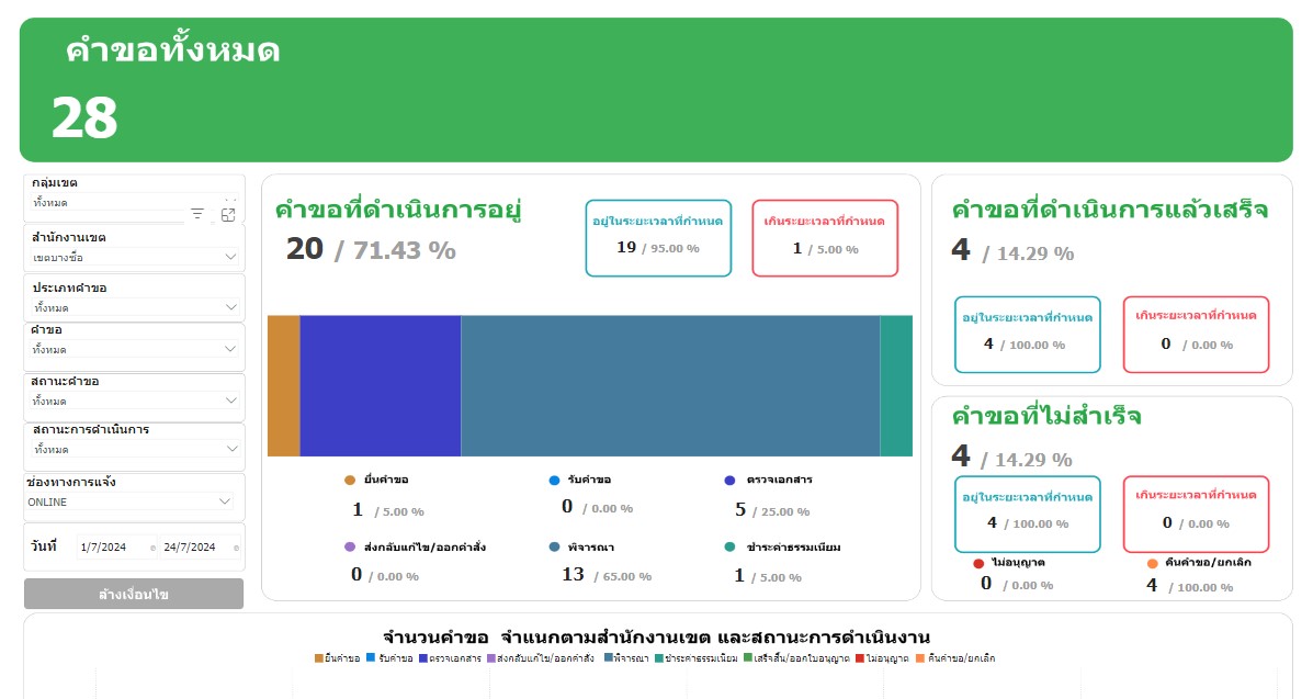 | 1414 | ![]() | 2024-07-25 00:00:00.0000000 | 0.00 | 0.00 | ประจำเดือนกรกฎาคม 2567 (ข้อมูล ณ วันที่ 25 ก.ค. 67) ผู้รับบริการผ่านระบบทั้งหมด BMA OSS จำนวน 316 ราย online จำนวน 28 ราย คิดเป็นร้อยละ 8.86 ข้อมูลตั้งแต่ 1 ต.ค. 66 - 25 ก.ค. 67 มีผู้รับบริการผ่านระบบทั้งหมด BMA OSS จำนวน 2,524 ราย online จำนวน 99 ราย คิดเป็นร้อยละ 3.92 | ||