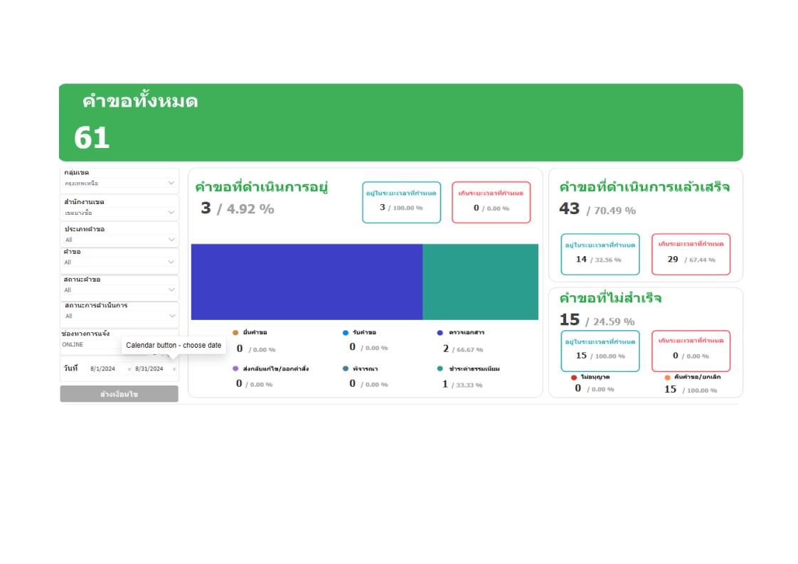 | 1414 | ![]() | 2024-08-31 00:00:00.0000000 | 0.00 | 0.00 | ประจำเดือนสิงหาคม 2567 (ข้อมูล ณ วันที่ 30 ส.ค. 67) ผู้รับบริการผ่านระบบทั้งหมด BMA OSS จำนวน 401 ราย online จำนวน 61 ราย คิดเป็นร้อยละ 15.21 | ||