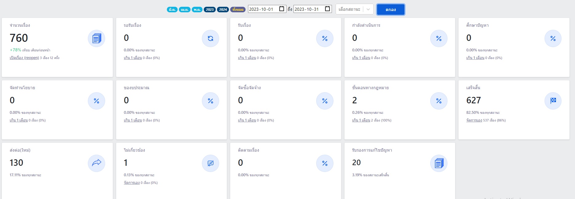 | 1363 | ![]() | 2024-06-25 00:00:00.0000000 | 99.63 | 0.00 | เดือนตุลาคม 2566 - ทั้งหมด 760 (100%) - รอรับเรื่อง 0 - กำลังดำเนินการ 0 (0%) - ศึกษาปัญหา 0 (0 %) - จัดทำนโยบาย 0 - ของบประมาณ 0 (0%) - จัดซื้อจัดจ้าง 0 - ขั้นตอนทางกฎหมาย 2 (0.26%) - เสร็จสิ้น 627 (82.50%) - ส่งต่อ 130 (17.11%) - ไม่เกี่ยวข้อง 1 (0.13%). - ติดตามเรื่อง 0 |
