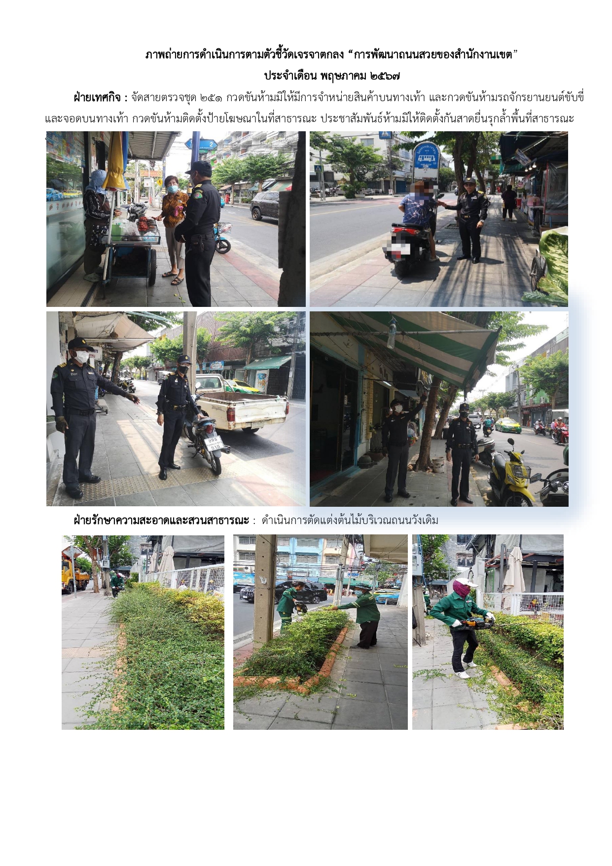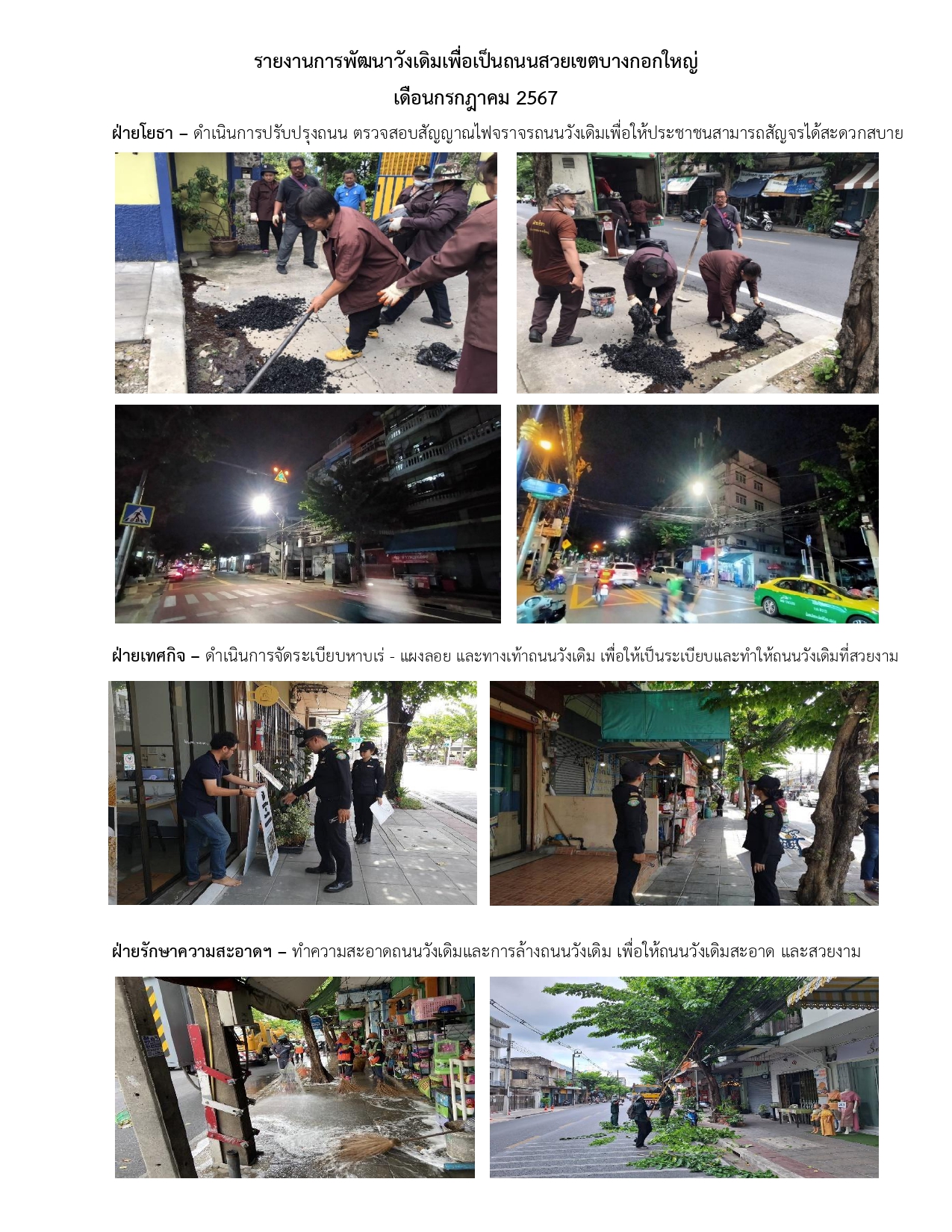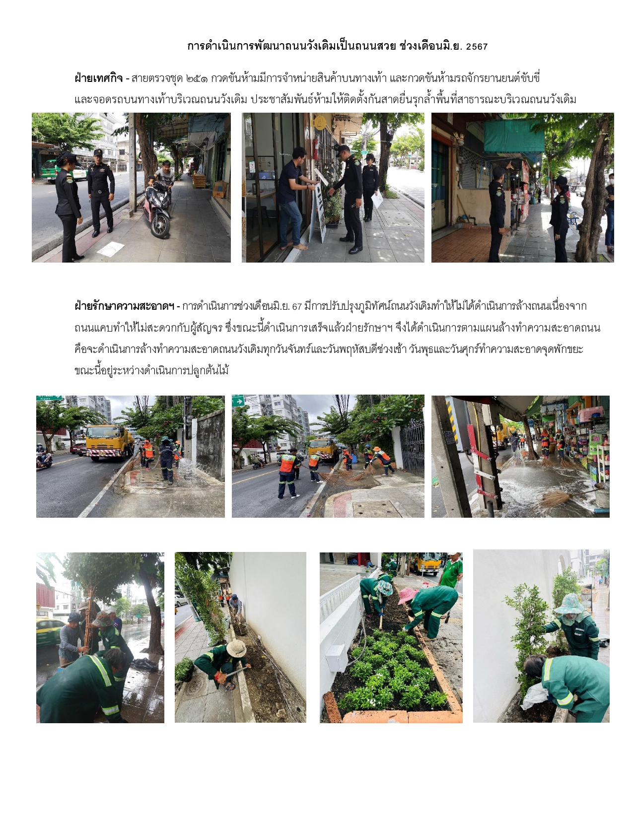 | 1 | ![]() | 2024-06-26 00:00:00.0000000 | 0.10 | 0.00 | ฝ่ายเทศกิจกวดขันห้ามจำหน่ายสินค้าบนทางเท้า กวดขันห้ามขับขี่รถจักรยานและจอดรถบนทางเท้า ประชาสัมพันธ์ห้ามติดตั้งกันสาดยื่นรุกล้ำพื้นที่สาธารณะบริเวณถนนวังเดิม ฝ่ายรักษาความสะอาดฯ การดำเนินการช่วงเดือนมิ.ย. 67 มีการปรับปรุงภูมิทัศน์ถนนวังเดิมทำให้ไม่ได้ดำเนินการล้างถนนเนื่องจากถนนแคบทำให้ไม่สะดวกกับผู้สัญจร ซึ่งขณะนี้ดำเนินการเสร็จแล้วฝ่ายรักษาฯ จึงได้ดำเนินการตามแผนล้างทำความสะอาดถนน คือจะดำเนินการล้างทำความสะอาดถนนวังเดิมทุกวันจันทร์และวันพฤหัสบดีช่วงเช้า วันพุธและวันศุกร์ทำความสะอาดจุดพักขยะ | ||