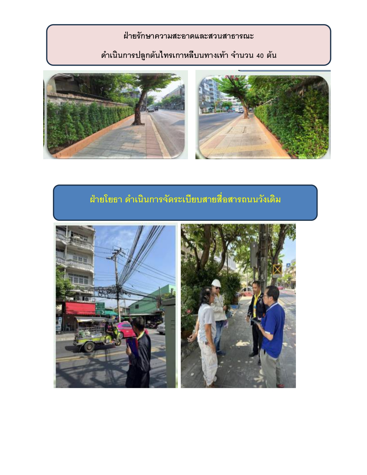 | 1 | ![]() | 2024-04-22 00:00:00.0000000 | 0.15 | 0.00 | สำนักการโยธาเลือกถนนวังเดิม เพื่อพัฒนาเป็นถนนสวยประจำเขตบางกอกใหญ่ โดยฝ่ายรักษาความสะอาดฯ ดำเนินการปลูกต้นไทรเกาหลีบนทางเท้า จำนวน 40 ต้น และฝ่ายโยธา ดำเนินการจัดระเบียบสายสื่อสาร | ||
