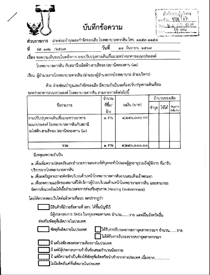 5182024-09-24 00:00:00.00000005.000.00ดำเนินการขอความเห็นชอบในหลักการ งานปรับปรุงทางเดินเชื่อมระหว่างอาคารอเนกประสงค์ โรงพยาบาลตากสินกับสถานีรถไฟฟ้าสายสีทอง (สถานีคลองสาน G3) และเสนอรายชื่อเจ้าหน้าที่เพื่อแต่งตั้งคณะกรรมการฯ เรียบร้อยแล้ว