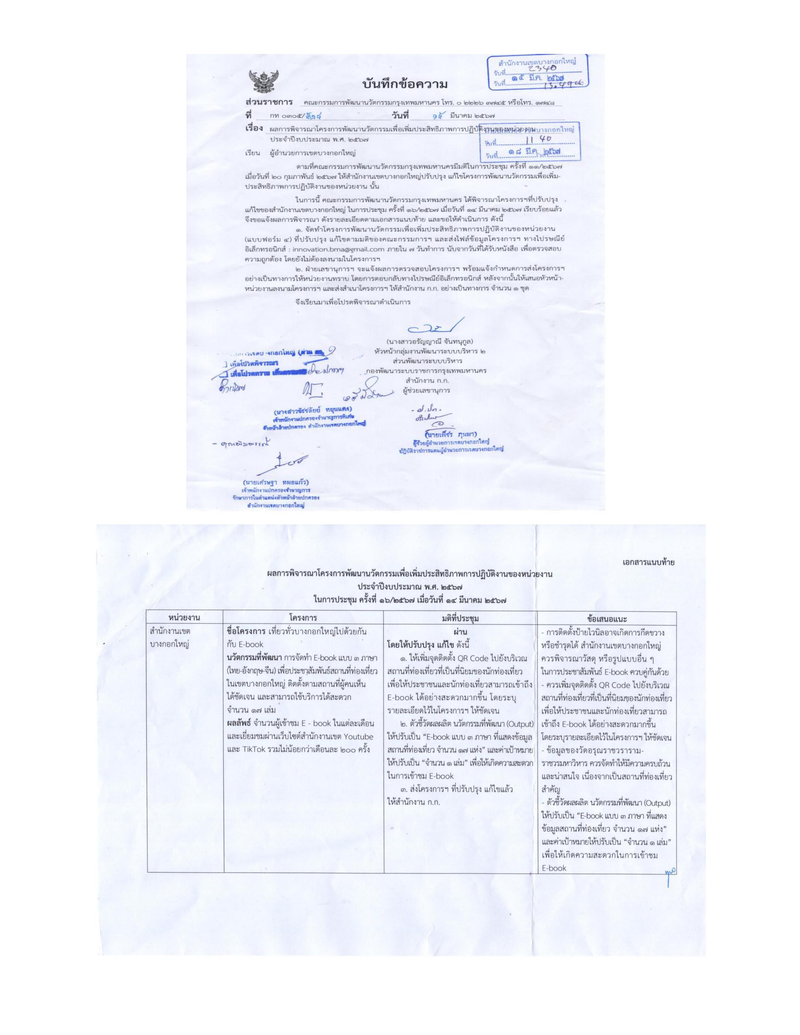| 127 | ![]() | 2024-03-25 00:00:00.0000000 | 10.00 | 0.00 | ฝ่ายปกครอง สำนักงานเขตบางกอกใหญ่ได้ส่งโครงการ "เที่ยวทั่วบางกอกใหญ่ไปด้วยกัน" แก้ไขครั้งที่ 3 แก่คณะกรรมการพัฒนานวัตกรรมกรุงเทพมหานคร และคณะกรรมการได้มีหนังสือ ที่ กท 0305/524 ลงวันที่ 15 มีนาคม 2567 มติที่ประชุมผ่านการพิจารณา โดยให้ปรับปรุง แก้ไข ดังนี้ 1. ให้เพิ่มจุดติดตั้ง QR Code ไปยังบริเวณสถานที่ท่องเที่ยวที่เป็นที่นิยมของนักท่องเที่ยวสามารถเข้าถึง E-book ได้อย่างสะดวกมากขึ้น โดยระบุรายละเอียดไว้ในโครงการฯ ให้ชัดเจน 2. ตัวชี้วัดผลผลิตนวัตกรรมที่พัฒนา (Output) ให้ปรับเป็น E-book แบบ 3 ภาษา ที่แสดงข้อมูลสถานที่ท่องเที่ยว จำนวน 17 แห่ง และค่าเป้าหมายให้ปรับเป็น จำนวน 1 เล่ม เพื่อให้เกิดความสะดวกในการเข้าชม E-book 3. ส่งโครงการฯ ที่ปรับปรุงแก้ไขแล้วให้สำนักงาน ก.ก. แล้ว | ||