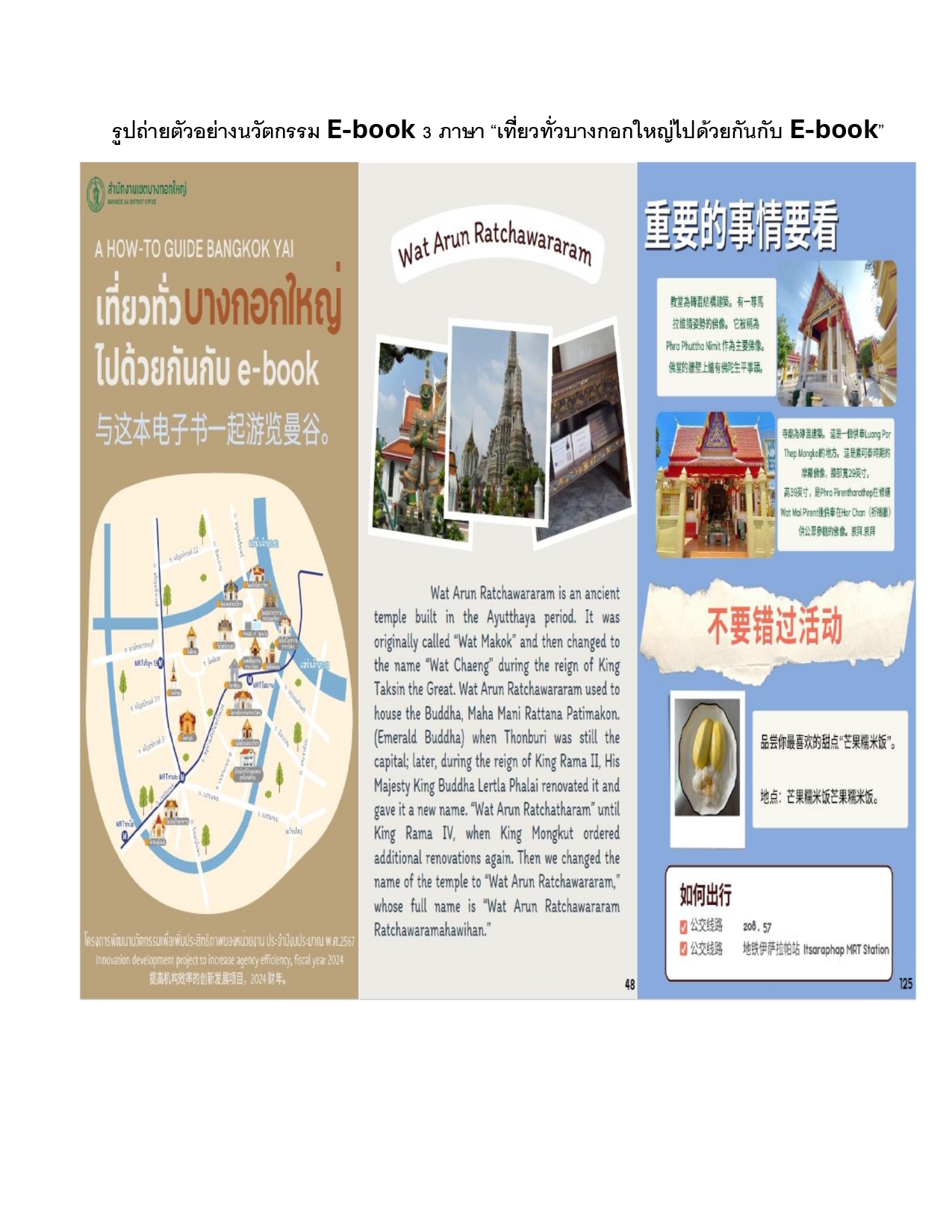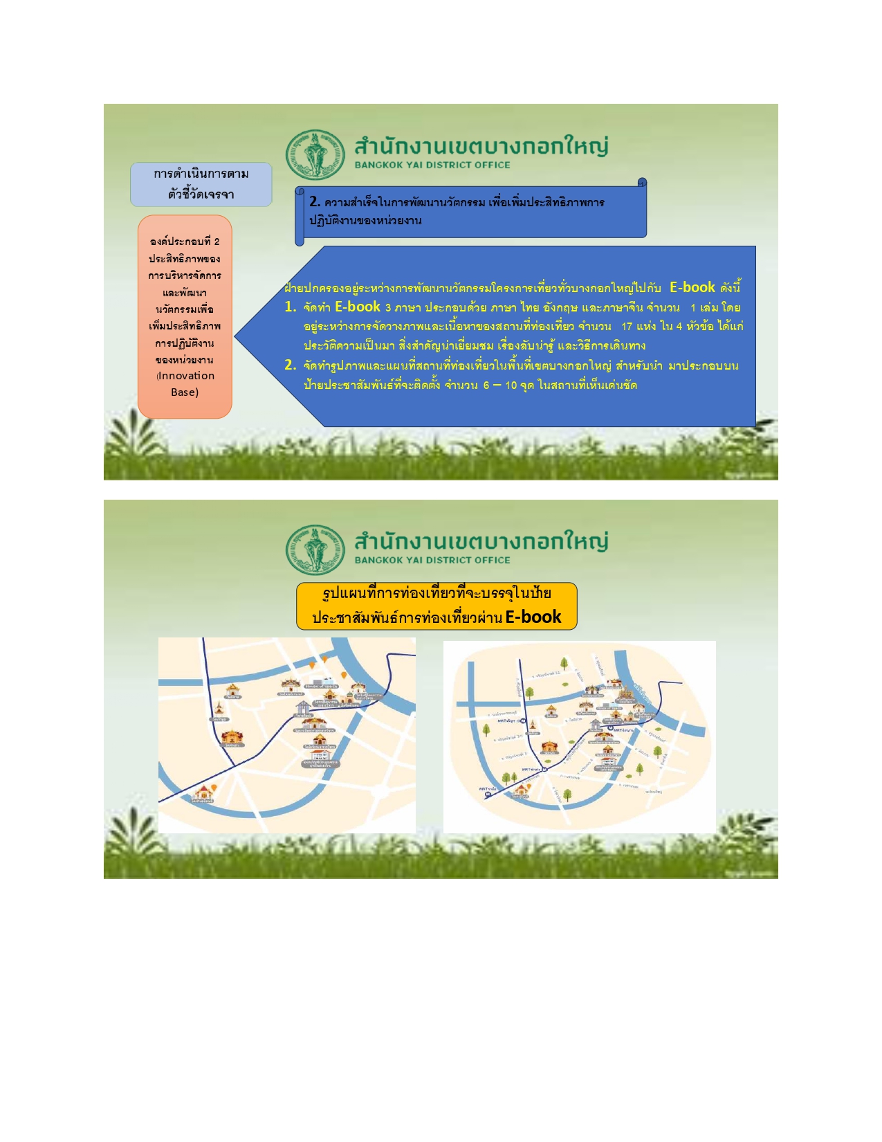 | 127 | ![]() | 2024-04-24 00:00:00.0000000 | 10.00 | 0.00 | ฝ่ายปกครองอยู่ระหว่างการพัฒนานวัตกรรมโครงการเที่ยวทั่วบางกอกใหญ่ไปกับ E-book ดังนี้ จัดทำ E-book 3 ภาษา ประกอบด้วย ภาษา ไทย อังกฤษ และภาษาจีน จำนวน 1 เล่ม โดยอยู่ระหว่างการจัดวางภาพและเนื้อหาของสถานที่ท่องเที่ยว จำนวน 17 แห่ง ใน 4 หัวข้อ ได้แก่ ประวัติความเป็นมา สิ่งสำคัญน่าเยี่ยมชม เรื่องลับน่ารู้ และวิธีการเดินทาง จัดทำรูปภาพและแผนที่สถานที่ท่องเที่ยวในพื้นที่เขตบางกอกใหญ่ สำหรับนำมาประกอบบนป้ายประชาสัมพันธ์ที่จะติดตั้ง จำนวน 6 – 10 จุด ในสถานที่เห็นเด่นชัด | ||