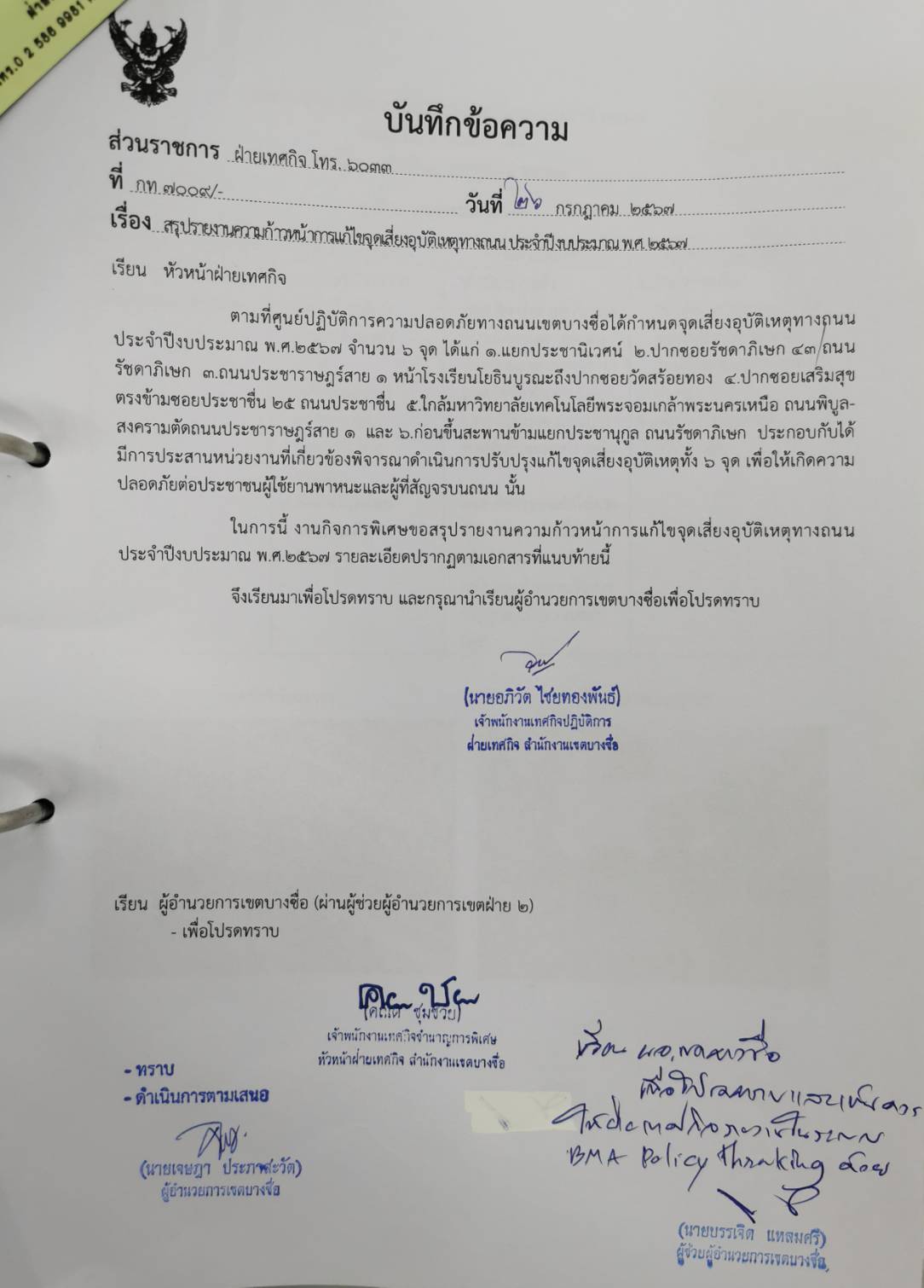 | 11 | ![]() | 2024-05-26 00:00:00.0000000 | 0.00 | 0.00 | อยู่ในระหว่าง ดำเนินการตามแผนโครงการ (ทำหนังสือประสาน สำนักการจราจรและขนส่ง เร่งรัดดำเนินการแก้ไขจุดเสี่ยงอุบัติเหตุในพื้นที่เขตบางซื่อ จำนวน 6 จุด) จุดที่ 1 บริเวณแยกประชานิเวศน์ จุดที่ 2 บริเวณกลับรถใกล้ซอยรัชดาภิเษก 43 ถนนรัชดาภิเษก จุดที่ 3 บริเวณสะพานข้ามแยกประชานุกูล ใกล้ปากซอยรัชดาภิเษก 64 ถนนรัชดาภิเษก จุดที่ 4 บริเวณใกลซอยประชาชื่น 25 ถนนประชาชื่น จุดที่ 5 บริเวณถนนประชาราษฎร์สาย 1 หน้าโรงเรียนโยธินบูรณะถึงปากซอยวัดสร้อยทอง จุดที่ 6 บริเวณใกล้มหาวิทยาลัยเทคโนโลยีพระจอมเกล้าพระนครเหนือ ถนนพิบูลสงคราม | ||