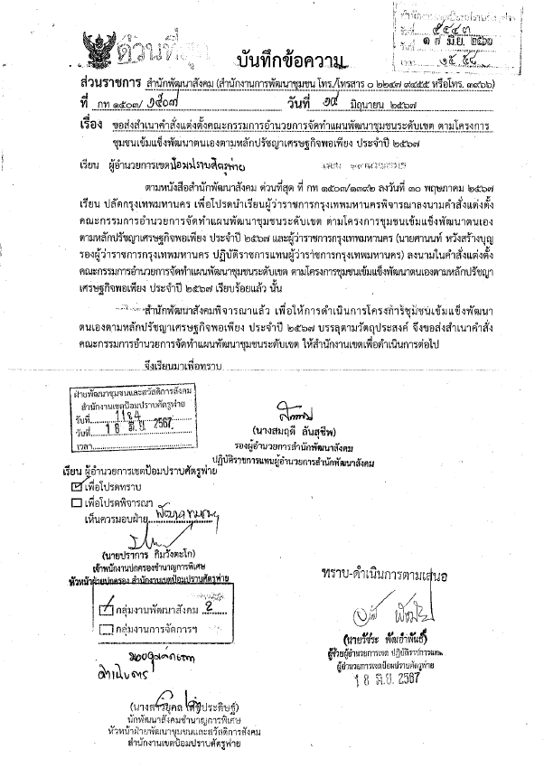 | 19 | ![]() | 2024-07-02 00:00:00.0000000 | 0.00 | 0.00 | สำนักงานเขตได้ส่งร่างคำสั่งแต่งตั้งคณะกรรมการอำนวยการจัดทำแผนพัฒนาชุมชนระดับเขตให้สำนักพัฒนาสังคมเพื่อเสนอร่างคำสั่งแต่งตั้งคณะกรรมการอำนวยการจัดทำแผนพัฒนาชุมชนระดับเขต ให้ผู้ว่าราชการกรุงเทพมหานครลงนาม โดยผู้ว่าราชการกรุงเทพมหานครลงนามคำสั่ง เมื่อวันที่ 12 มิถุนายน 2567 กำหนดจัดประชุม เพื่อพิจารณาอนุมัติโครงการ 2 ครั้ง ในวันที่ 9 และวันที่ 25 กรกฎาคม 2567 | ||