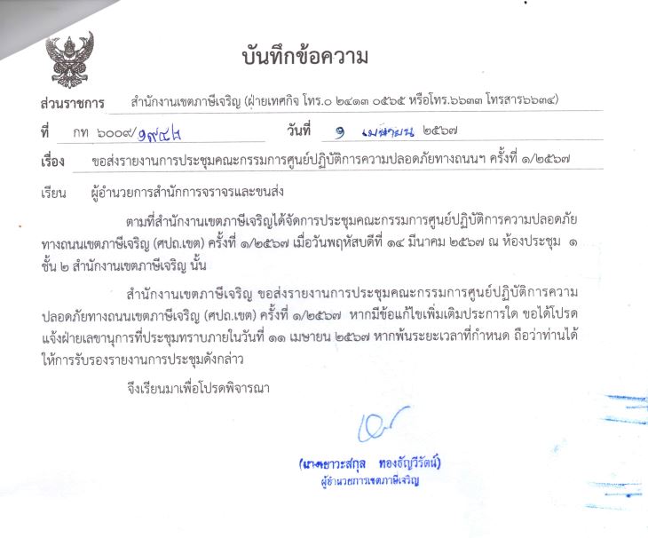 | 11 |  | 2024-02-21 00:00:00.0000000 | 0.00 | 0.00 |  | กำหนดการประชุมคณะทำงานศปถ.เขตภาษีเจริญและทำหนังสือเชิญประชุมในวันที่ 14 มีนาคม 2567 | |