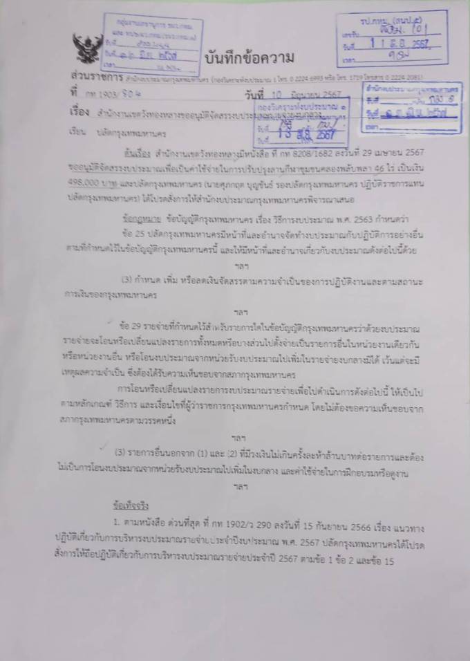 132024-07-25 00:00:00.00000000.000.00ได้รับอนุมัตินจัดสรรงบประมาณรายจ่ายงบกลางเรียบร้อยแล้ว ตามบันทึก ที่ กท 1903/804 ลงวันที่ 10 มิถุนายน 2567 และขอความอนุเคราะห์ให้ฝ่ายโยธาดำเนินการจ้างเหมาการปรับปรุงลานกีฬาชุมชนพลับพลา 46 ไร่