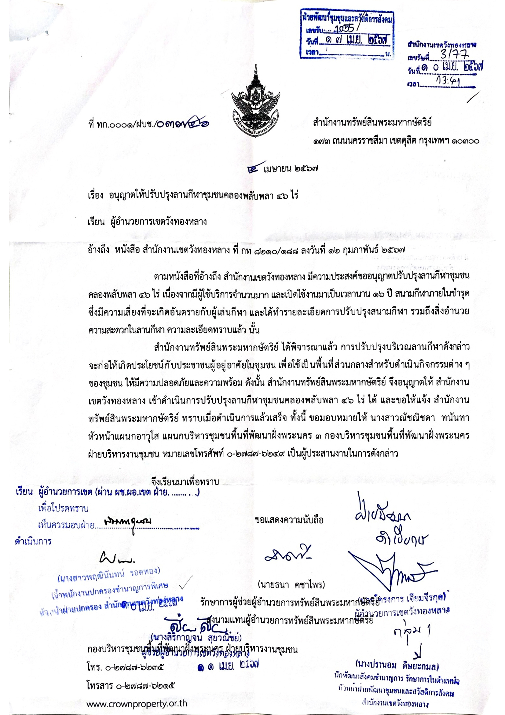 132024-04-18 00:00:00.00000000.000.00ได้รับหนังสืออนุญาตให้ดำเนินการปรับปรุงลานกีฬาชุมชนคลองพลับพลา 46 ไร่ จากสำนักงานทรัพย์สินพระมหากษัตริย์เรียบร้อยแล้ว ขณะนี้อยู่ระหว่างขออนุมัติจัดสรรงบประมาณรายจ่ายงบกลางเพื่อดำเนินการปรับปรุงลานกีฬา